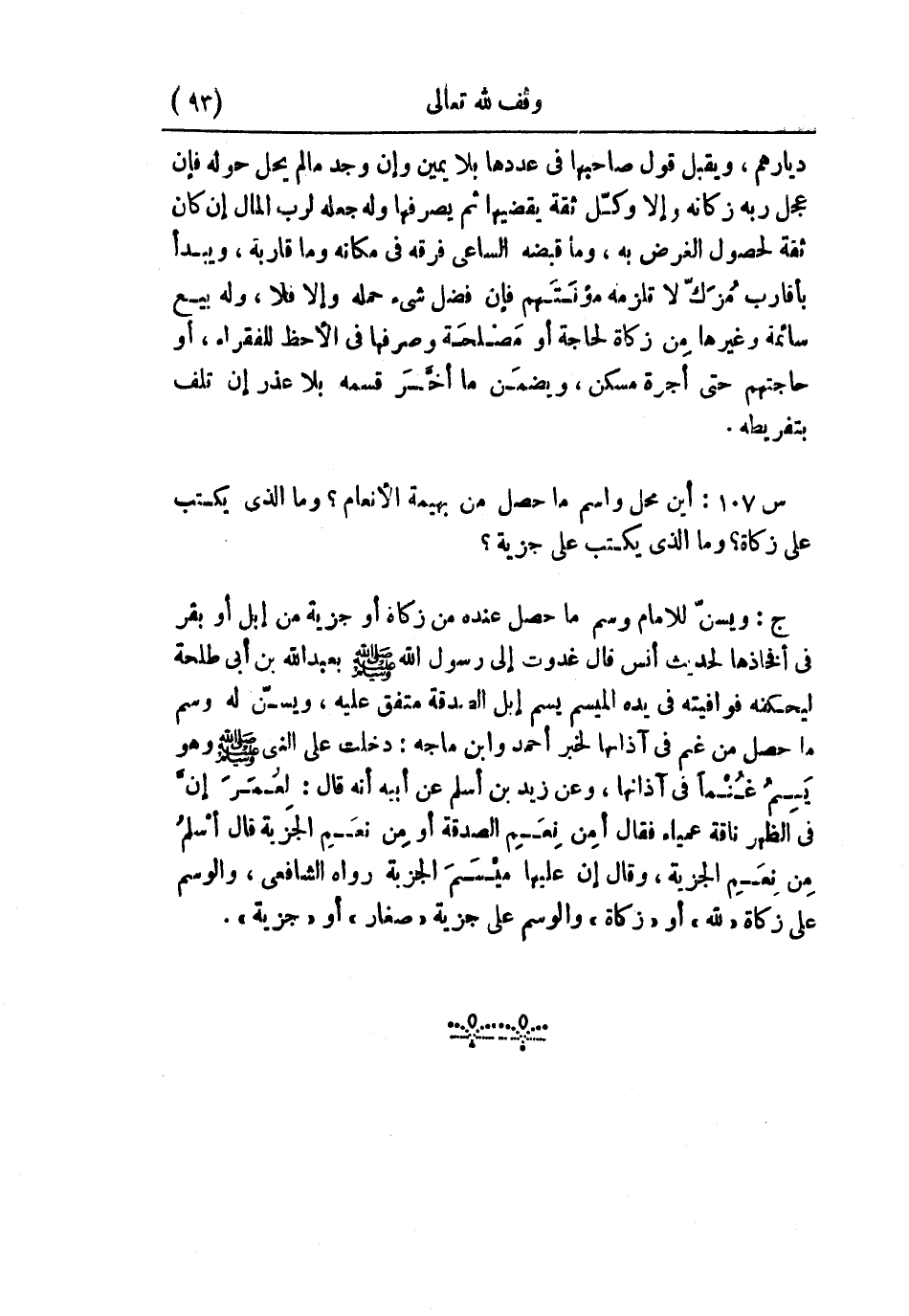 ج: ويُسن للإمام وسم ما حصل عنده من زكاة أو جزية من إبل أو بقر في أفخاذها؛ لحديث أنس، قال: غدوت إلى رسول الله - صلى الله عليه وسلم - بعبد الله بن أبي طلحة ليحكنه فوافيته في يده الميسم يسم إبل الصدقة، متفق عليه. ويُسن له وسم ما حصل من غنم في آذانها لخبر أحمد وابن ماجه: دخلت على النبي - صلى الله عليه وسلم - وهو يَسِمُ غنمًا في آذانها، وعن زيد بن أسلم عن أبيه قال: لعُمَرَ إنَّ في الظهر ناقة عمياء، فقال: أمِن نِعيم الصدقة أو مِن نعَمِ الجزية، قال: أسلمُ من نِعَمِ الجزية، وقال: إن عليها ميْسم الجزية، رواه الشافعي، والوسم على زكاة «لله» أو «زكاة» والوسم على جزية «صغار» أو «جزية» .