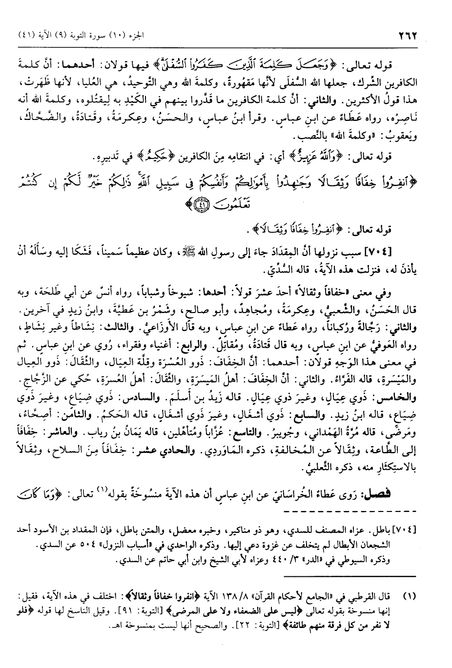 (1) قال القرطبي في «الجامع لأحكام القرآن» 8/ 138 الآية انْفِرُوا خِفافاً وَثِقالًا: اختلف في هذه الآية، فقيل: