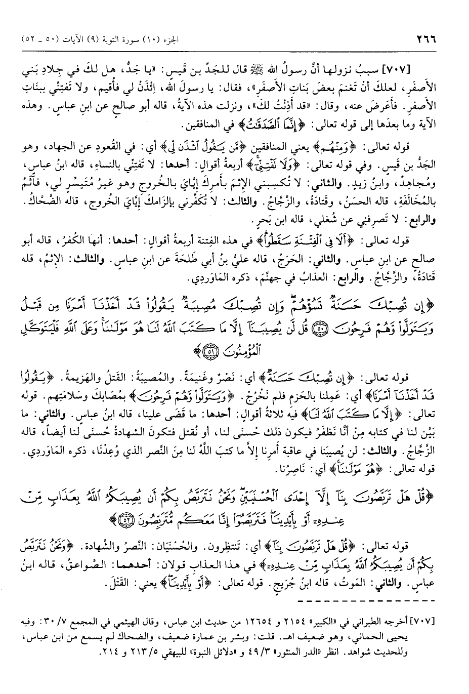 (707) سبب نزولها أنّ رسول الله صلى الله عليه وسلم قال للجَدِّ بن قيس: «يا جَدُّ، هل لك في جِلاد بني الأصفر، لعلك أن تغنم بعض بنات الأصفر» ، فقال: يا رسول الله، ائذن لي فأقيم، ولا تفتني ببنات الأصفر. فأعرض عنه، وقال: «قد أذنت لك» ، ونزلت هذه الآية، قاله أبو صالح عن ابن عباس. وهذه الآية وما بعدها إلى قوله تعالى: إِنَّمَا الصَّدَقاتُ في المنافقين.
