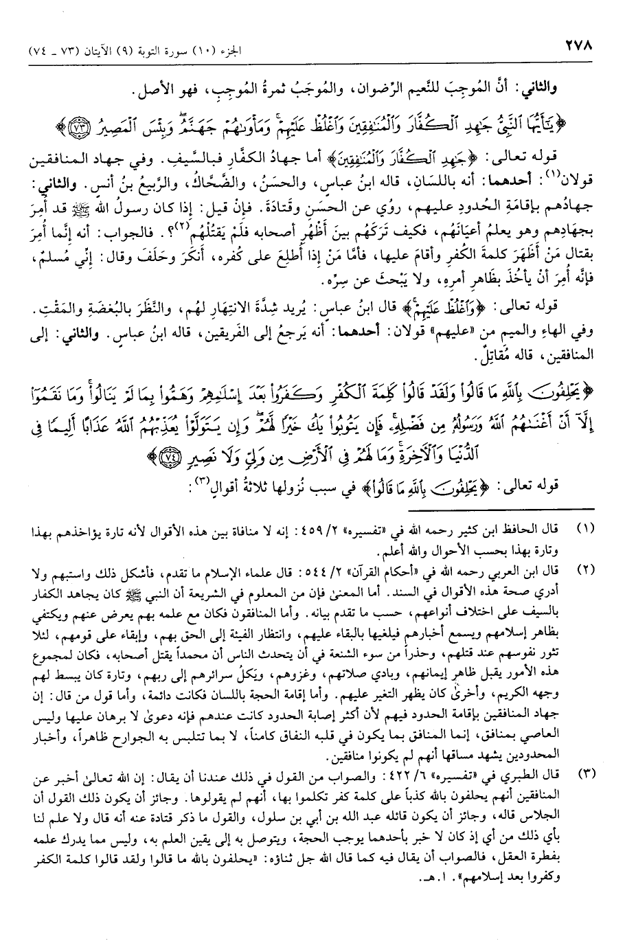 (2) قال ابن العربي رحمه الله في «أحكام القرآن» 2/ 544: قال علماء الإسلام ما تقدم، فأشكل ذلك واستبهم ولا أدري صحة هذه الأقوال في السند. أما المعنى فإن من المعلوم في الشريعة أن النبي صلى الله عليه وسلم كان يجاهد الكفار بالسيف على اختلاف أنواعهم، حسب ما تقدم بيانه. وأما المنافقون فكان مع علمه بهم يعرض عنهم ويكتفي بظاهر إسلامهم ويسمع أخبارهم فيلغيها بالبقاء عليهم، وانتظار الفيئة إلى الحق بهم، وإبقاء على قومهم، لئلا تثور نفوسهم عند قتلهم، وحذرا من سوء الشنعة في أن يتحدث الناس أن محمدا يقتل أصحابه، فكان لمجموع هذه الأمور يقبل ظاهر إيمانهم، وبادي صلاتهم، وغزوهم، ويكل سرائرهم إلى ربهم، وتارة كان يبسط لهم وجهه الكريم، وأخرى كان يظهر التغير عليهم. وأما إقامة الحجة باللسان فكانت دائمة، وأما قول من قال: إن جهاد المنافقين بإقامة الحدود فيهم لأن أكثر إصابة الحدود كانت عندهم فإنه دعوى لا برهان عليها وليس العاصي بمنافق، إنما المنافق بما يكون في قلبه النفاق كامنا، لا بما تتلبس به الجوارح ظاهرا، وأخبار المحدودين يشهد مساقها أنهم لم يكونوا منافقين.