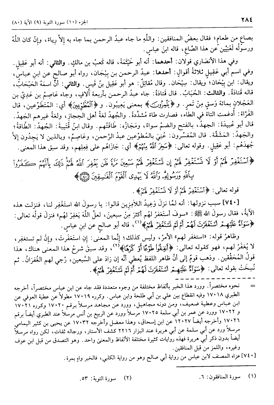 (740) سبب نزولها: أنه لما نزل وعيد اللامزين قالوا: يا رسول الله استغفر لنا، فنزلت هذه الآية، فقال رسول الله صلى الله عليه وسلم: «سوف أستغفر لهم أكثر من سبعين، لعل الله يغفر لهم» فنزل قوله تعالى:
