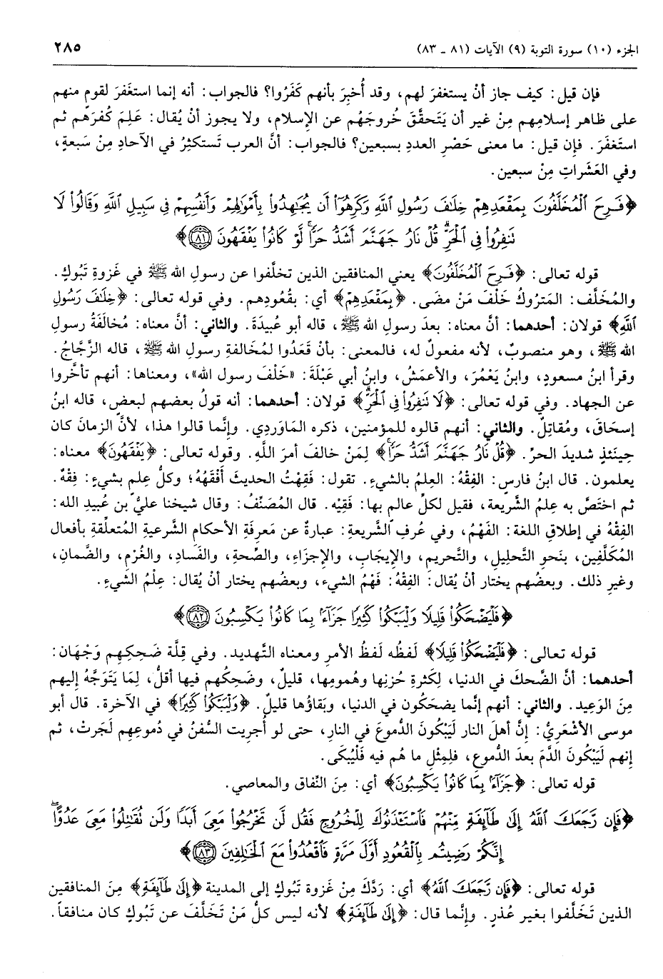 فَرِحَ الْمُخَلَّفُونَ بِمَقْعَدِهِمْ خِلافَ رَسُولِ اللَّهِ وَكَرِهُوا أَنْ يُجاهِدُوا بِأَمْوالِهِمْ وَأَنْفُسِهِمْ فِي سَبِيلِ اللَّهِ وَقالُوا لا تَنْفِرُوا فِي الْحَرِّ قُلْ نارُ جَهَنَّمَ أَشَدُّ حَرًّا لَوْ كانُوا يَفْقَهُونَ (81)
