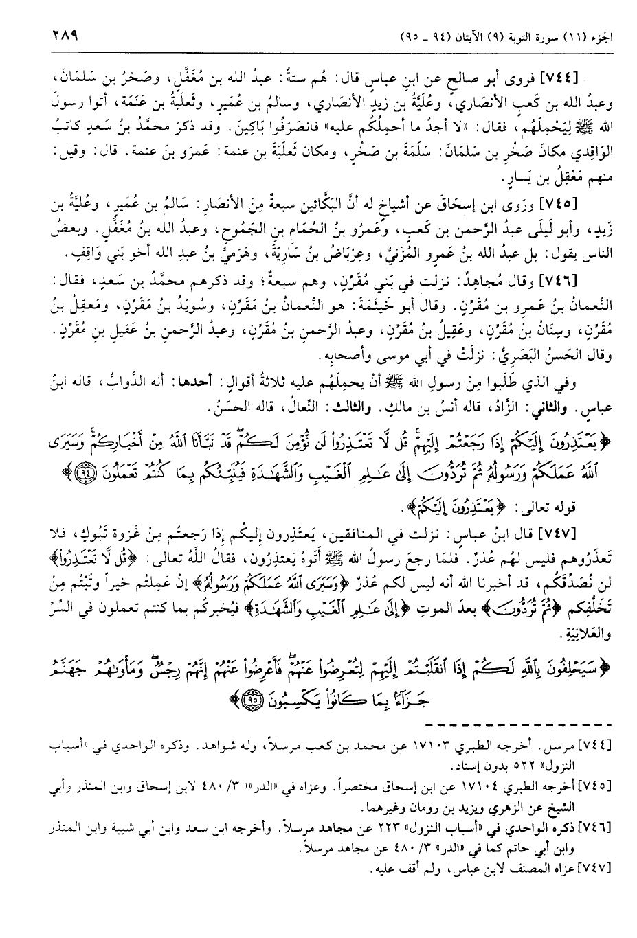 (747) قال ابن عباس: نزلت في المنافقين، يعتذرون إليكم إذا رجعتم من غزوة تبوك، فلا تعذروهم فليس لهم عذر. فلما رجع رسول الله صلى الله عليه وسلم أتوه يعتذرون، فقال الله تعالى: قُلْ لا تَعْتَذِرُوا لن نصدقكم، قد أخبرنا الله أنه ليس لكم عذر وَسَيَرَى اللَّهُ عَمَلَكُمْ وَرَسُولُهُ إن عملتم خيراً وتبتم من تخلُّفكم ثُمَّ تُرَدُّونَ بعد الموت إِلى عالِمِ الْغَيْبِ وَالشَّهادَةِ فيخبركم بما كنتم تعملون في السر والعلانية.