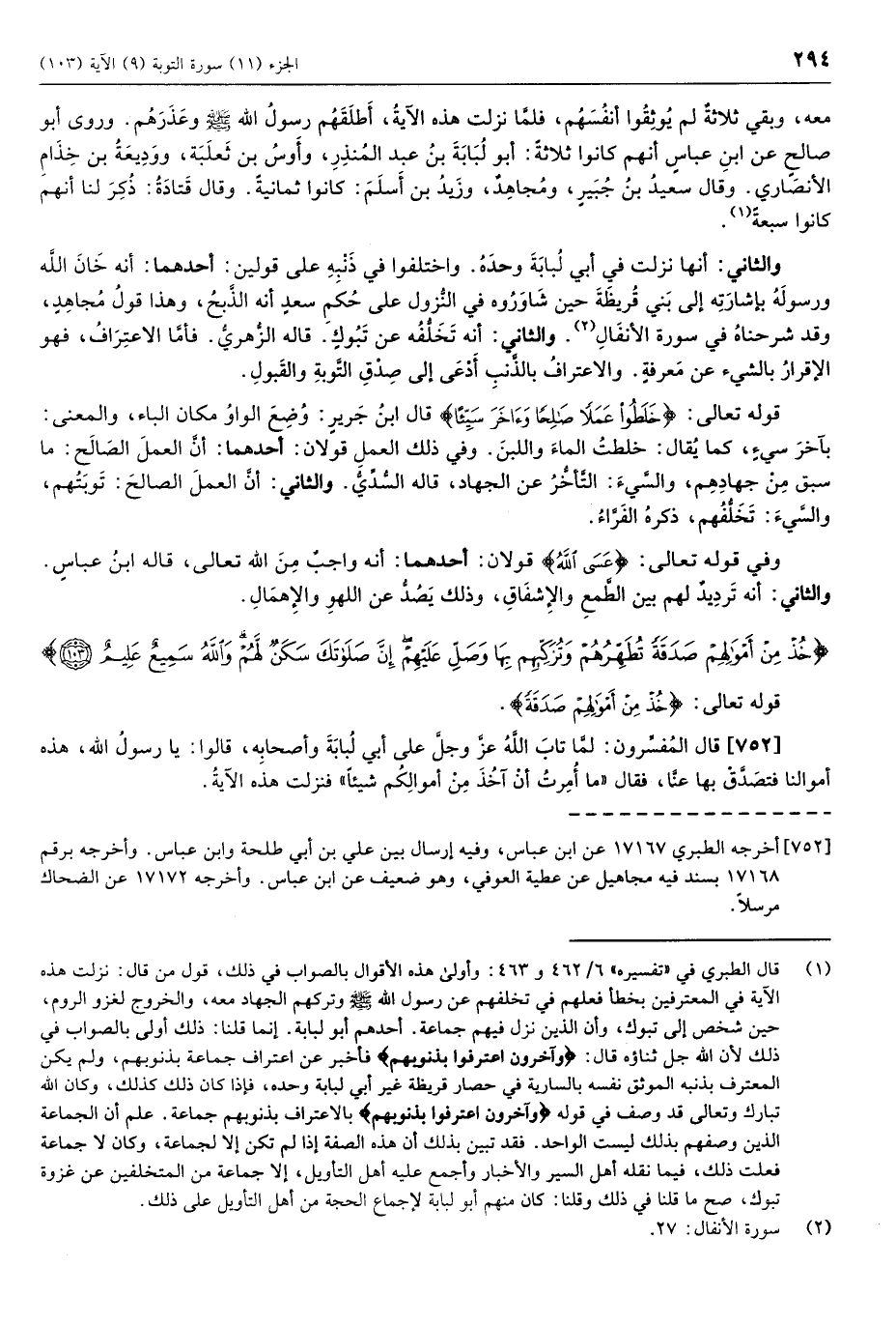 (752) قال المفسّرون: لمّا تاب الله عزّ وجلّ على أبي لبابة وأصحابه، قالوا: يا رسول الله، هذه أموالنا فتصدق بها عنا، فقال «ما أُمرت أن آخذ من أموالكم شيئاً» فنزلت هذه الآية.