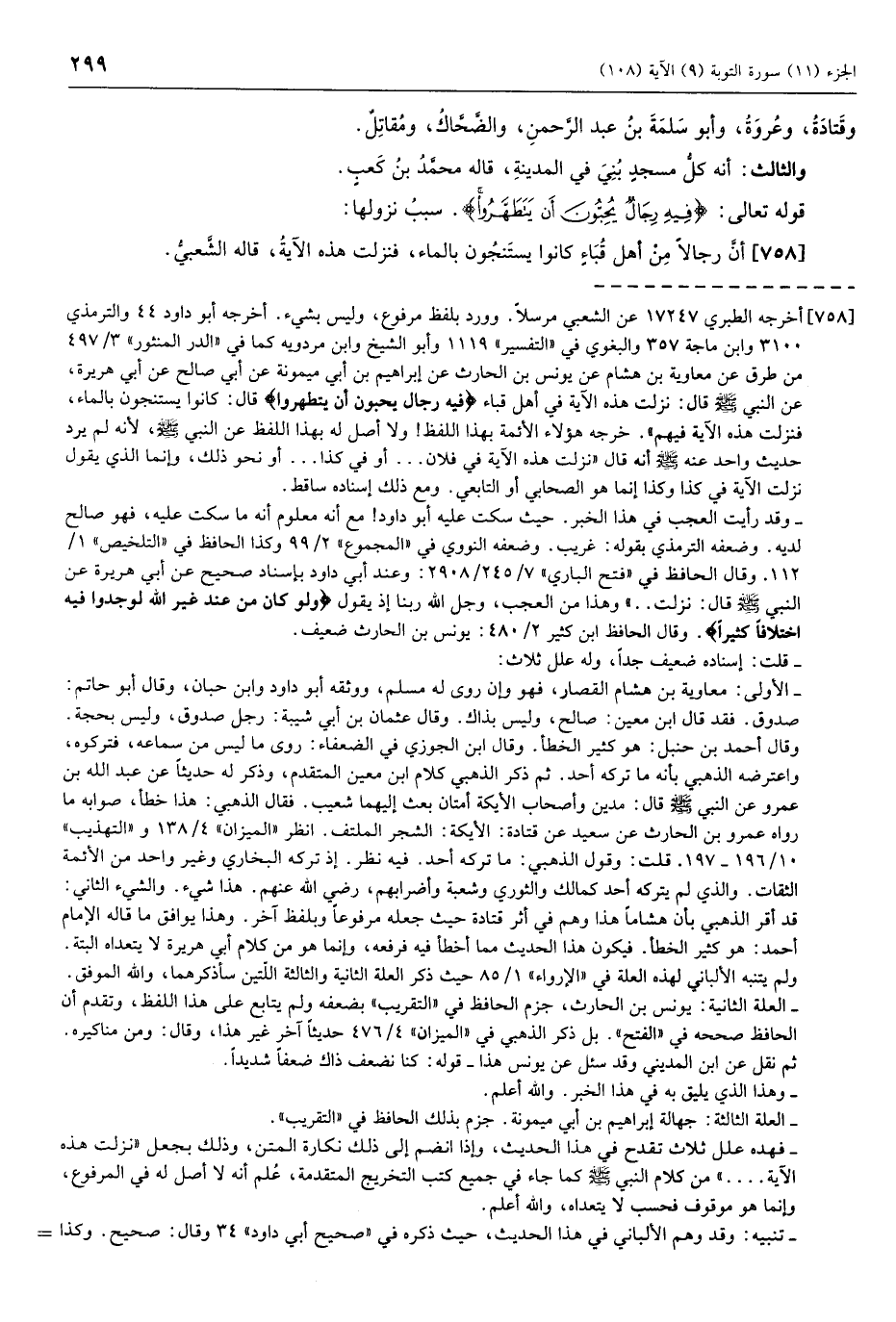 - وقد رأيت العجب في هذا الخبر. حيث سكت عليه أبو داود! مع أنه معلوم أنه ما سكت عليه، فهو صالح لديه. وضعفه الترمذي بقوله: غريب. وضعفه النووي في «المجموع» 2/ 99 وكذا الحافظ في «التلخيص» 1/ 112. وقال الحافظ في «فتح الباري» 7/ 245/ 2908: وعند أبي داود بإسناد صحيح عن أبي هريرة عن النبي صلى الله عليه وسلم قال: نزلت..» وهذا من العجب، وجل الله ربنا إذ يقول وَلَوْ كانَ مِنْ عِنْدِ غَيْرِ اللَّهِ لَوَجَدُوا فِيهِ اخْتِلافاً كَثِيراً. وقال الحافظ ابن كثير 2/ 480: يونس بن الحارث ضعيف.