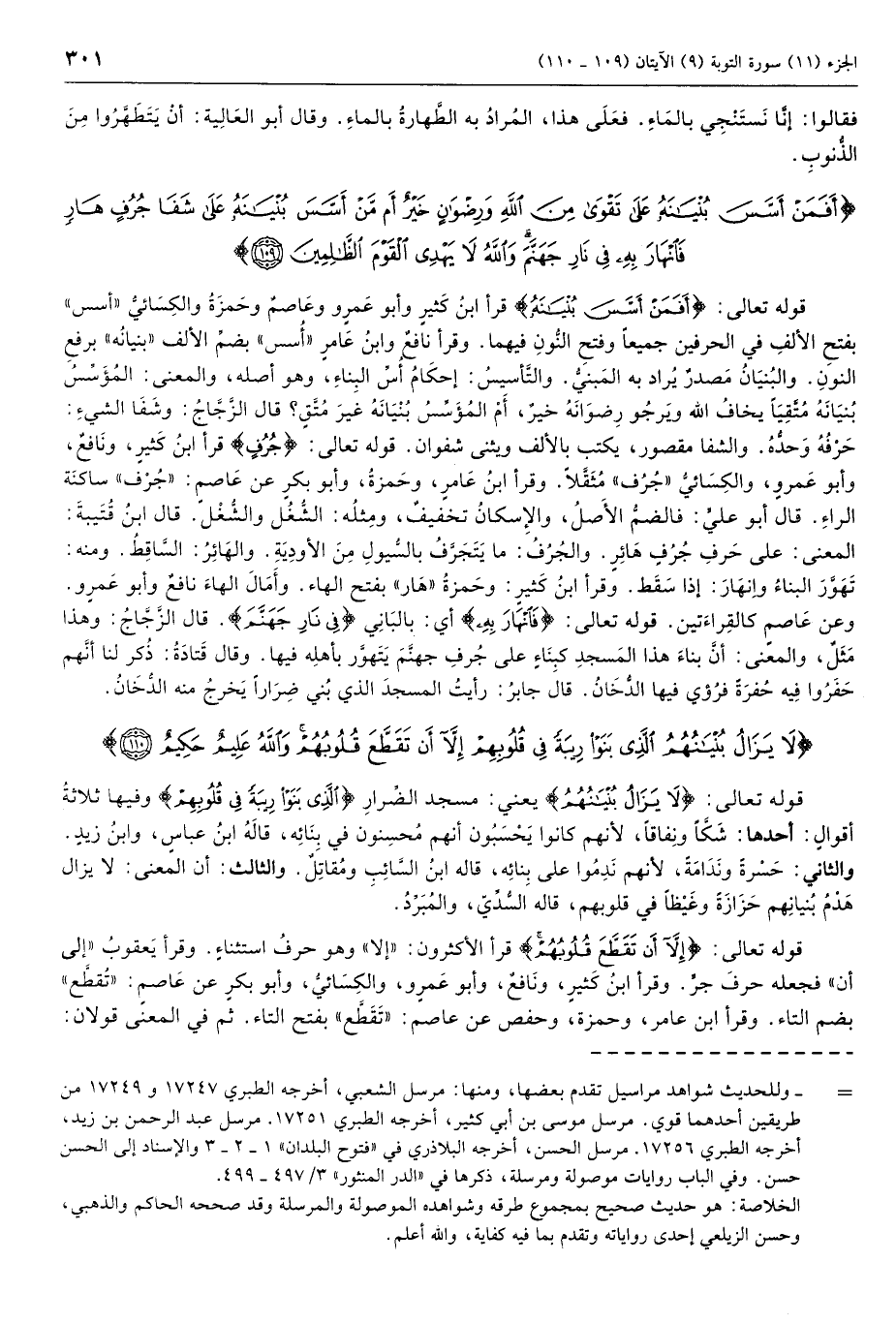 قوله تعالى: أَفَمَنْ أَسَّسَ بُنْيانَهُ قرأ ابن كثير وأبو عمرو وعاصم وحمزة والكسائي «أَسس» بفتح الألف في الحرفين جميعاً وفتح النون فيهما. وقرأ نافع وابن عامر «أُسس» بضم الألف «بنيانُه» برفع النون. والبنيان مصدر يراد به المبني. والتأسيس: إحكام أس البناء، وهو أصله، والمعنى: المؤسِّس بنيانه متقياً يخاف الله ويرجو رضوانه خير، أم المؤسس بنيانه غير متق؟ قال الزجاج: وشفا الشيء: