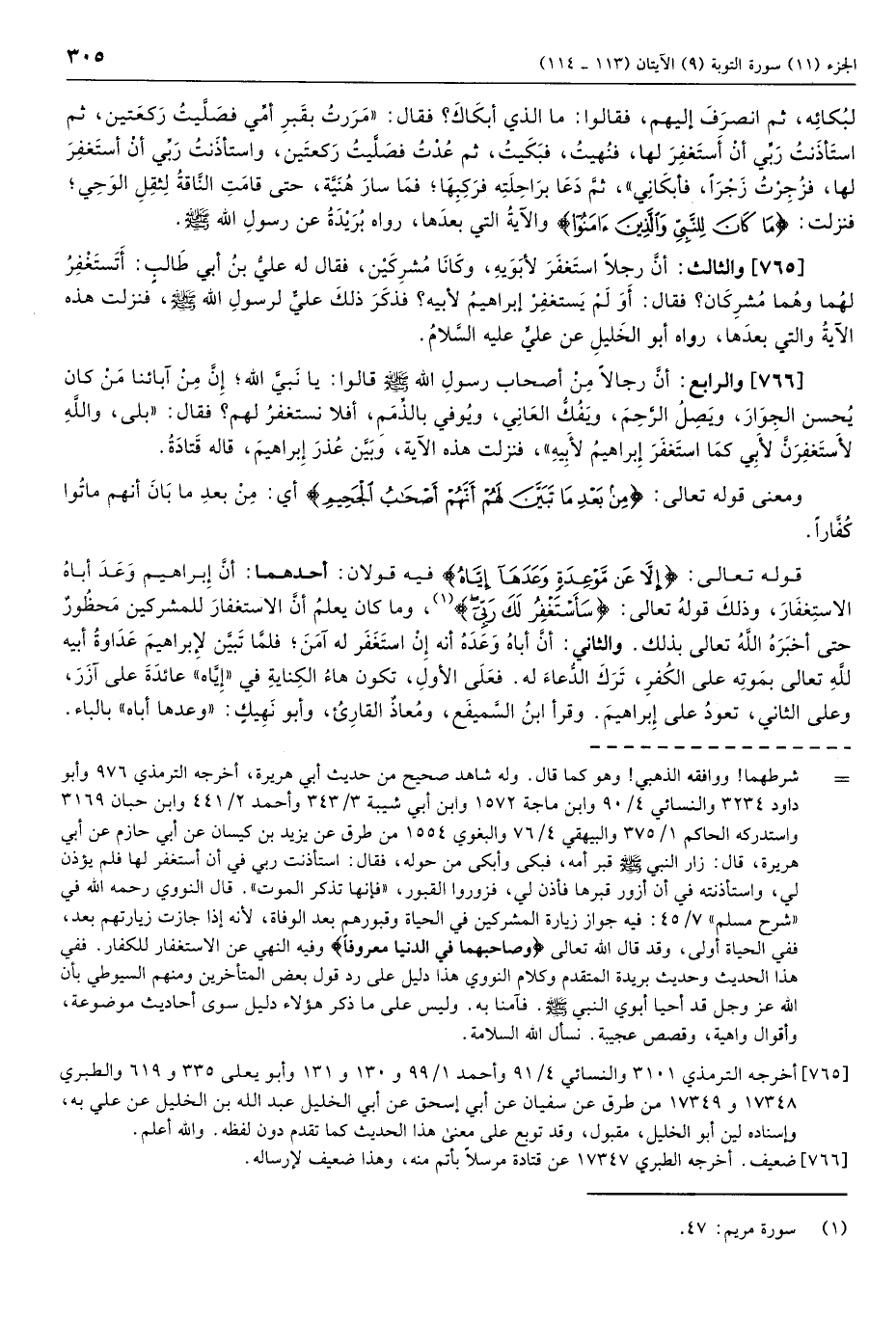 لبكائه، ثم انصرف إليهم، فقالوا: ما الذي أبكاك؟ فقال: «مررت بقبر أمي فصليت ركعتين، ثم استأذنت ربي أن أستغفر لها، فنُهيت، فبكيت، ثم عدت فصلّيت ركعتين، واستأذنت ربي أن أستغفر لها، فزُجرت زجراً، فأبكاني» ، ثمّ دعا براحلته فركبها فما سار هنيّة، حتى قامت الناقة لثقل الوحي فنزلت: ما كانَ لِلنَّبِيِّ وَالَّذِينَ آمَنُوا والأية التي بعدها، رواه بريدة عن رسول الله صلى الله عليه وسلم.