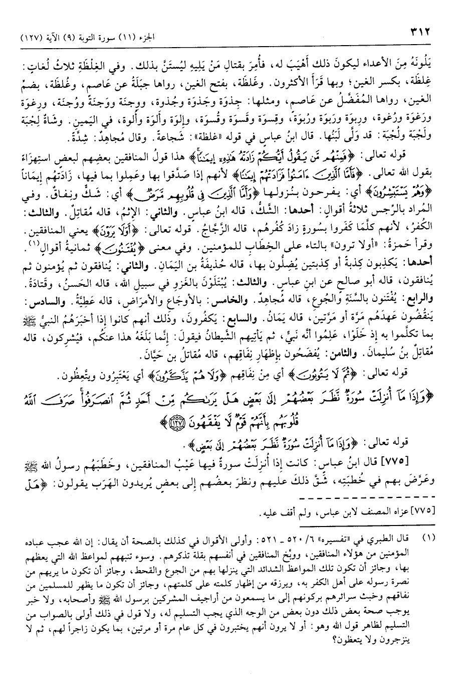 (775) قال ابن عباس: كانت إذا أُنزلت سورة فيها عيب المنافقين، وخطبهم رسول الله صلى الله عليه وسلم وعرَّض بهم في خطبته، شق ذلك عليهم ونظر بعضهم إلى بعض يريدون الهرب يقولون: هَلْ