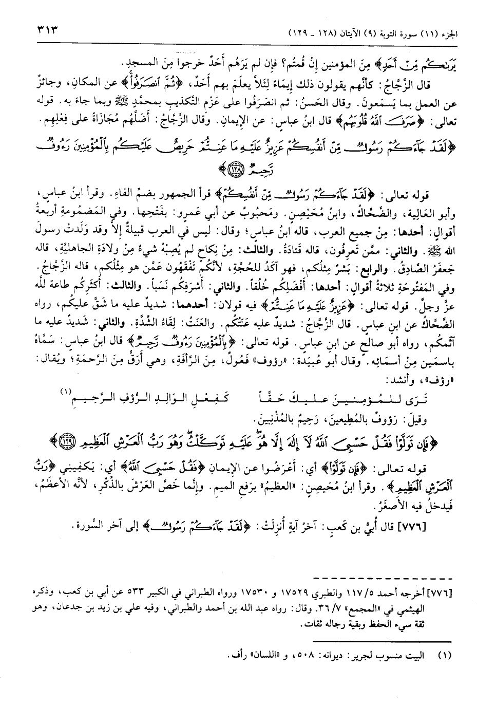 (776) قال أُبيّ بن كعب: آخر آية أُنزلت: لَقَدْ جاءَكُمْ رَسُولٌ إلى آخر السّورة.