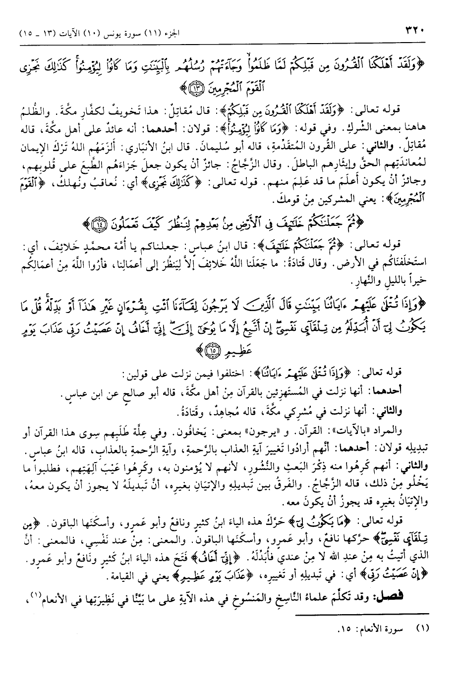 وَإِذا تُتْلى عَلَيْهِمْ آياتُنا بَيِّناتٍ قالَ الَّذِينَ لا يَرْجُونَ لِقاءَنَا ائْتِ بِقُرْآنٍ غَيْرِ هذا أَوْ بَدِّلْهُ قُلْ ما يَكُونُ لِي أَنْ أُبَدِّلَهُ مِنْ تِلْقاءِ نَفْسِي إِنْ أَتَّبِعُ إِلاَّ ما يُوحى إِلَيَّ إِنِّي أَخافُ إِنْ عَصَيْتُ رَبِّي عَذابَ يَوْمٍ عَظِيمٍ (15)