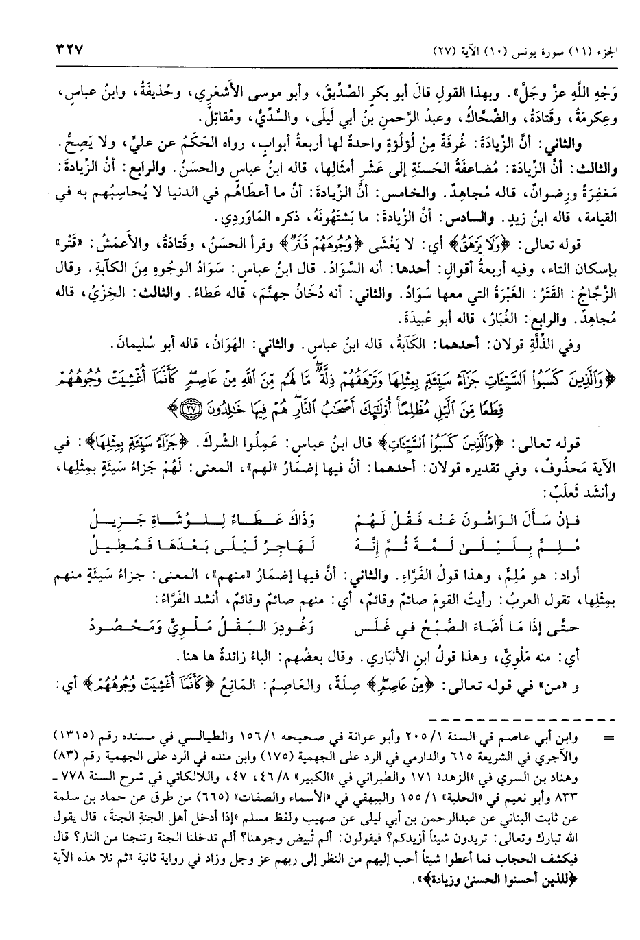 وابن أبي عاصم في السنة 1/ 205 وأبو عوانة في صحيحه 1/ 156 والطيالسي في مسنده رقم (1315) والآجري في الشريعة 615 والدارمي في الرد على الجهمية (175) وابن مندة في الرد على الجهمية رقم (83) وهناد بن السري في «الزهد» 171 والطبراني في «الكبير» 8/ 46، 47، واللالكائي في شرح السنة 778- 833 وأبو نعيم في «الحلية» 1/ 155 والبيهقي في «الأسماء والصفات» (665) من طرق عن حماد بن سلمة عن ثابت البناني عن عبد الرحمن بن أبي ليلى عن صهيب ولفظ مسلم «إذا أدخل أهل الجنة الجنة، قال يقول الله تبارك وتعالى: تريدون شيئا أزيدكم؟ فيقولون: ألم تبيض وجوهنا؟ ألم تدخلنا الجنة وتنجنا من النار؟ قال فيكشف الحجاب فما أعطوا شيئا أحب إليهم من النظر إلى ربهم عز وجل وزاد في رواية ثانية «ثم تلا هذه الآية لِلَّذِينَ أَحْسَنُوا الْحُسْنى وَزِيادَةٌ» .