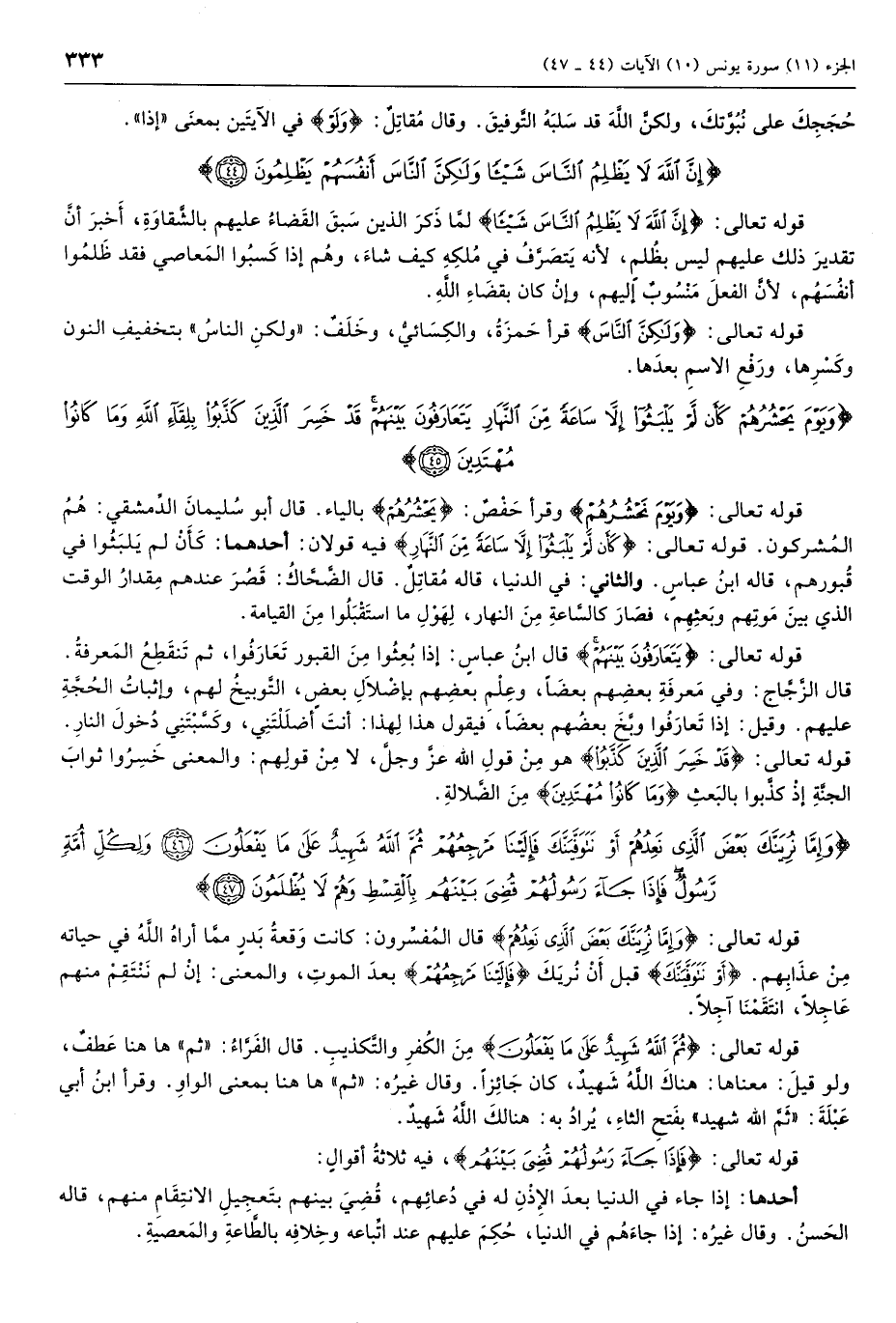قوله تعالى: وَيَوْمَ يَحْشُرُهُمْ وقرأ حفص: يَحْشُرُهُمْ بالياء. قال أبو سليمان الدمشقي: هم المشركون. قوله تعالى: كَأَنْ لَمْ يَلْبَثُوا إِلَّا ساعَةً مِنَ النَّهارِ فيه قولان: أحدهما: كأن لم يلبثوا في قبورهم، قاله ابن عباس. والثاني: في الدنيا، قاله مقاتل. قال الضحاك: قصر عندهم مقدار الوقت الذي بين موتهم وبعثهم، فصار كالساعة من النهار، لهول ما استقبلوا من القيامة.