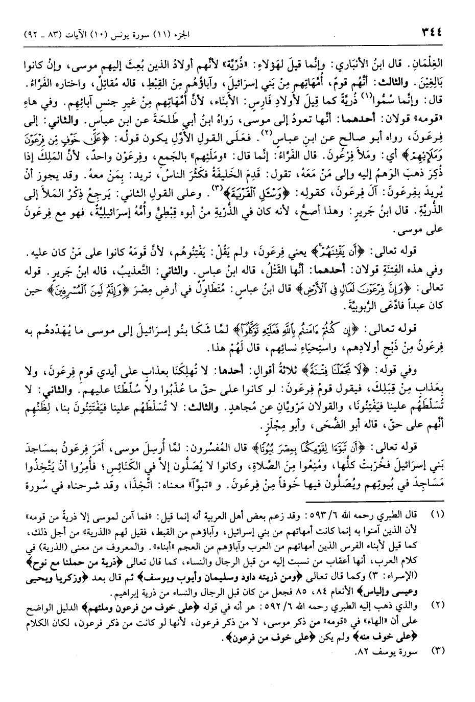 (2) والذي ذهب إليه الطبري رحمه الله 6/ 592: هو أنه في قوله عَلى خَوْفٍ مِنْ فِرْعَوْنَ وَمَلَائِهِمْ الدليل الواضح على أن «الهاء» في «قومه» من ذكر موسى، لا من ذكر فرعون، لأنها لو كانت من ذكر فرعون، لكان الكلام عَلى خَوْفٍ منه ولم يكن عَلى خَوْفٍ مِنْ فِرْعَوْنَ.