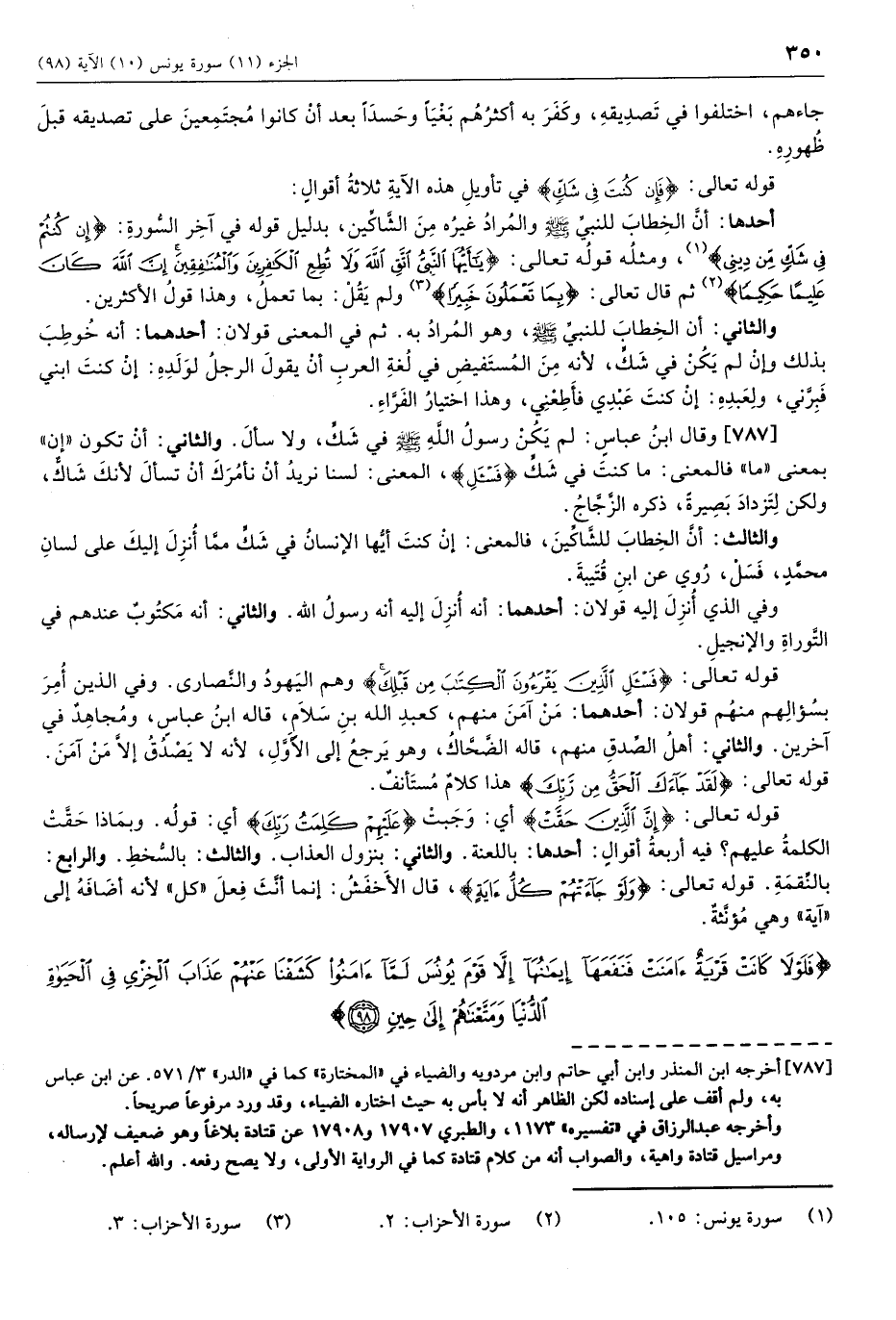 (787) وقال ابن عباس: لم يكن رسول الله صلى الله عليه وسلم في شك، ولا سأل. والثاني: أن تكون «إِن» بمعنى «ما» فالمعنى: ما كنت في شكّ فَسْئَلِ، المعنى: لسنا نريد أن نأمرك أن تسأل لأنك شاكّ، ولكن لتزداد بصيرة، ذكره الزجاج.