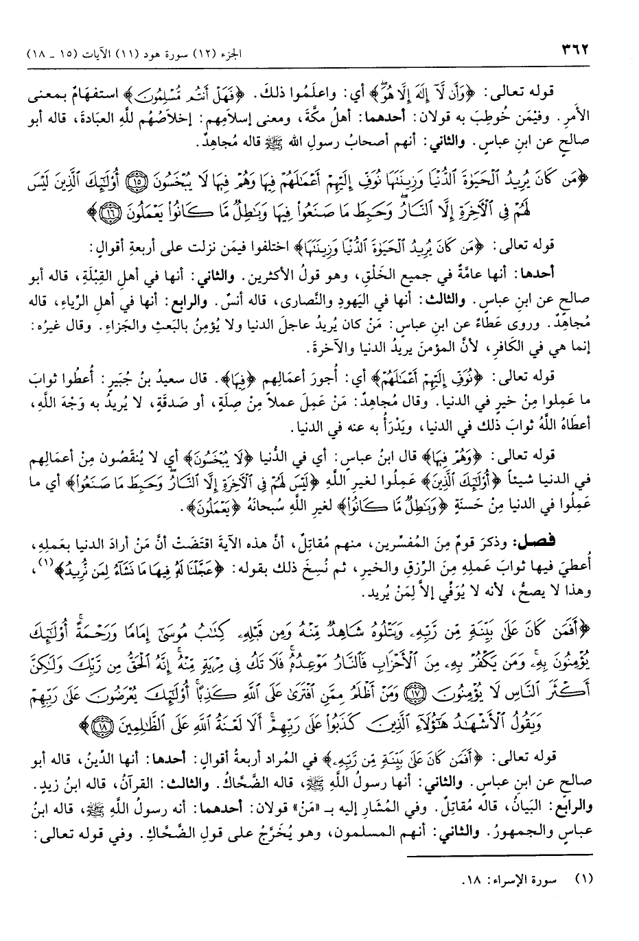 أَفَمَنْ كانَ عَلى بَيِّنَةٍ مِنْ رَبِّهِ وَيَتْلُوهُ شاهِدٌ مِنْهُ وَمِنْ قَبْلِهِ كِتابُ مُوسى إِماماً وَرَحْمَةً أُولئِكَ يُؤْمِنُونَ بِهِ وَمَنْ يَكْفُرْ بِهِ مِنَ الْأَحْزابِ فَالنَّارُ مَوْعِدُهُ فَلا تَكُ فِي مِرْيَةٍ مِنْهُ إِنَّهُ الْحَقُّ مِنْ رَبِّكَ وَلكِنَّ أَكْثَرَ النَّاسِ لا يُؤْمِنُونَ (17) وَمَنْ أَظْلَمُ مِمَّنِ افْتَرى عَلَى اللَّهِ كَذِباً أُولئِكَ يُعْرَضُونَ عَلى رَبِّهِمْ وَيَقُولُ الْأَشْهادُ هؤُلاءِ الَّذِينَ كَذَبُوا عَلى رَبِّهِمْ أَلا لَعْنَةُ اللَّهِ عَلَى الظَّالِمِينَ (18)