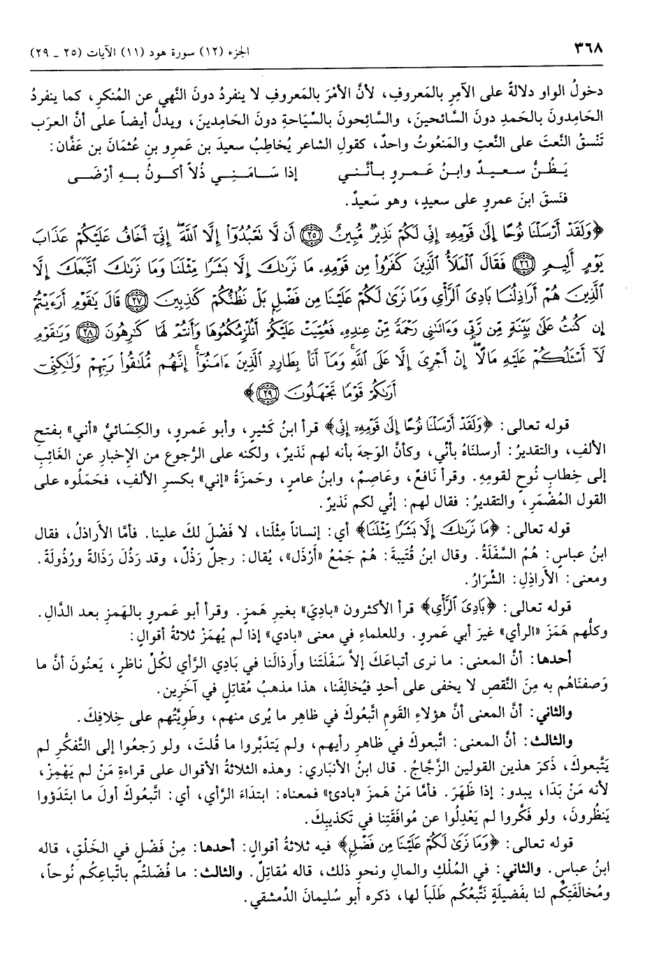 وَلَقَدْ أَرْسَلْنا نُوحاً إِلى قَوْمِهِ إِنِّي لَكُمْ نَذِيرٌ مُبِينٌ (25) أَنْ لا تَعْبُدُوا إِلاَّ اللَّهَ إِنِّي أَخافُ عَلَيْكُمْ عَذابَ يَوْمٍ أَلِيمٍ (26) فَقالَ الْمَلَأُ الَّذِينَ كَفَرُوا مِنْ قَوْمِهِ ما نَراكَ إِلاَّ بَشَراً مِثْلَنا وَما نَراكَ اتَّبَعَكَ إِلاَّ الَّذِينَ هُمْ أَراذِلُنا بادِيَ الرَّأْيِ وَما نَرى لَكُمْ عَلَيْنا مِنْ فَضْلٍ بَلْ نَظُنُّكُمْ كاذِبِينَ (27) قالَ يا قَوْمِ أَرَأَيْتُمْ إِنْ كُنْتُ عَلى بَيِّنَةٍ مِنْ رَبِّي وَآتانِي رَحْمَةً مِنْ عِنْدِهِ فَعُمِّيَتْ عَلَيْكُمْ أَنُلْزِمُكُمُوها وَأَنْتُمْ لَها كارِهُونَ (28) وَيا قَوْمِ لا أَسْئَلُكُمْ عَلَيْهِ مالاً إِنْ أَجرِيَ إِلاَّ عَلَى اللَّهِ وَما أَنَا بِطارِدِ الَّذِينَ آمَنُوا إِنَّهُمْ مُلاقُوا رَبِّهِمْ وَلكِنِّي أَراكُمْ قَوْماً تَجْهَلُونَ (29)