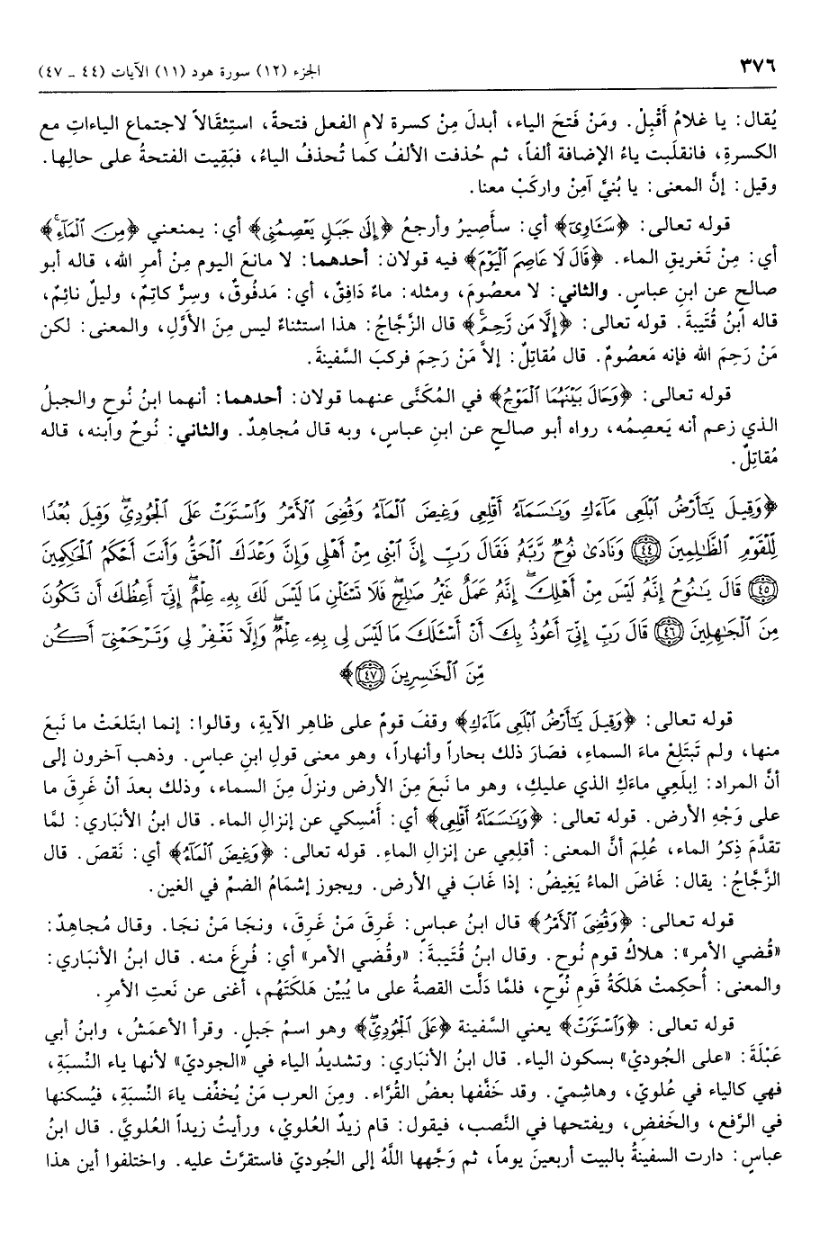 وَقِيلَ يا أَرْضُ ابْلَعِي ماءَكِ وَيا سَماءُ أَقْلِعِي وَغِيضَ الْماءُ وَقُضِيَ الْأَمْرُ وَاسْتَوَتْ عَلَى الْجُودِيِّ وَقِيلَ بُعْداً لِلْقَوْمِ الظَّالِمِينَ (44) وَنادى نُوحٌ رَبَّهُ فَقالَ رَبِّ إِنَّ ابْنِي مِنْ أَهْلِي وَإِنَّ وَعْدَكَ الْحَقُّ وَأَنْتَ أَحْكَمُ الْحاكِمِينَ (45) قالَ يا نُوحُ إِنَّهُ لَيْسَ مِنْ أَهْلِكَ إِنَّهُ عَمَلٌ غَيْرُ صالِحٍ فَلا تَسْئَلْنِ ما لَيْسَ لَكَ بِهِ عِلْمٌ إِنِّي أَعِظُكَ أَنْ تَكُونَ مِنَ الْجاهِلِينَ (46) قالَ رَبِّ إِنِّي أَعُوذُ بِكَ أَنْ أَسْئَلَكَ ما لَيْسَ لِي بِهِ عِلْمٌ وَإِلاَّ تَغْفِرْ لِي وَتَرْحَمْنِي أَكُنْ مِنَ الْخاسِرِينَ (47)