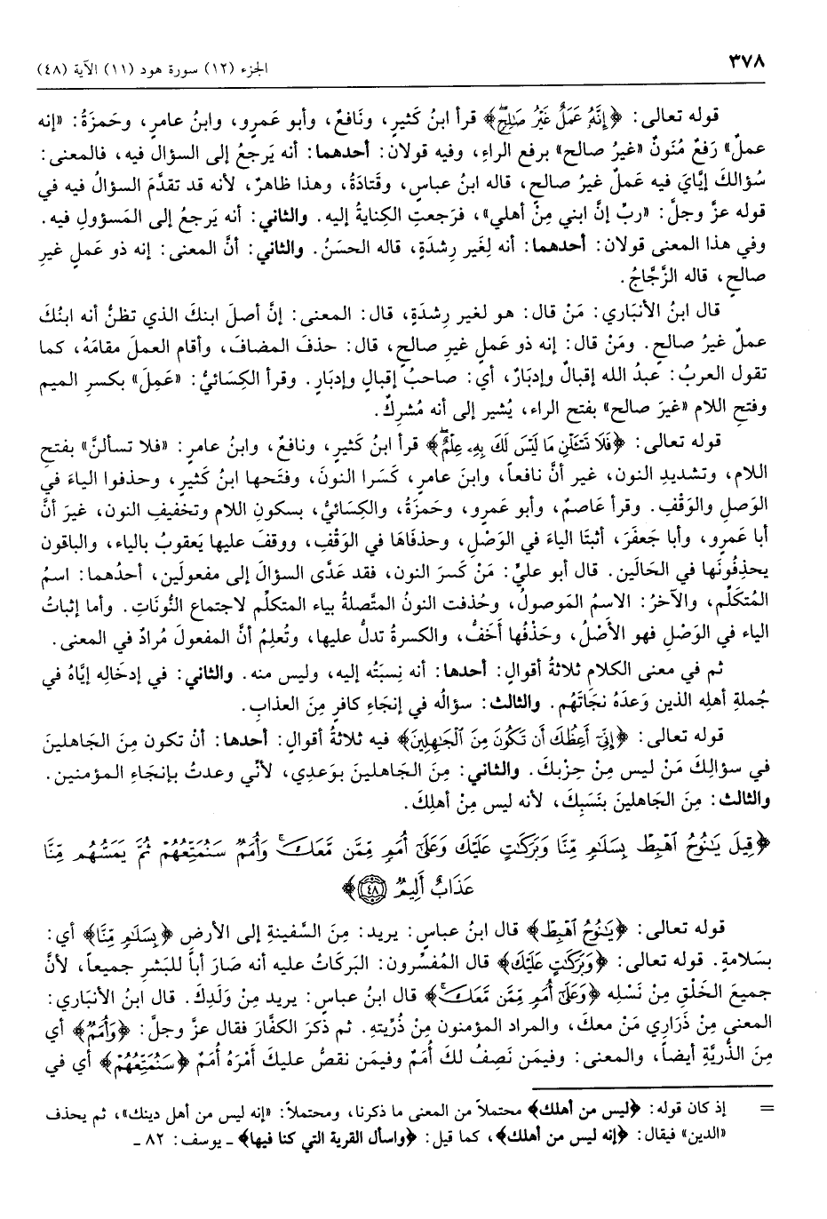 قال ابن الأنباري: من قال: هو لغير رِشدة، قال: المعنى: إِن أصل أبنك الذي تظن أنه أبنك عملٌ غير صالح. ومن قال: إِنه ذو عمل غير صالح، قال: حذف المضاف، وأقام العمل مقامه، كما تقول العرب: عبد الله إِقبال وإِدبار، أي: صاحب إِقبال وإِدبار. وقرأ الكسائي: «عَمِلَ» بكسر الميم وفتح اللام «غيرَ صالح» بفتح الراء، يشير إِلى أنه مشرك.