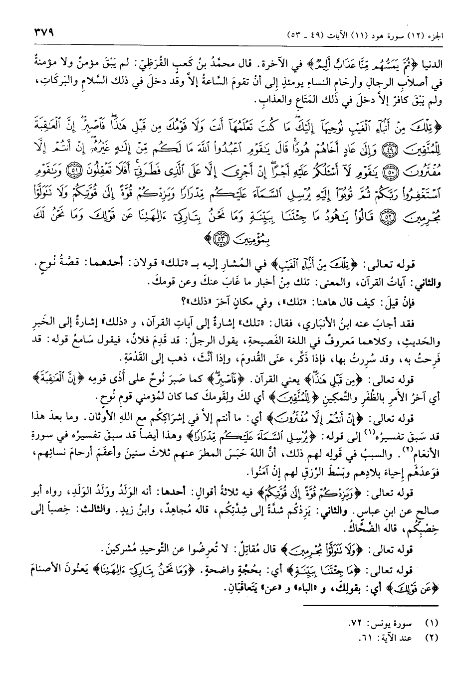 تِلْكَ مِنْ أَنْباءِ الْغَيْبِ نُوحِيها إِلَيْكَ ما كُنْتَ تَعْلَمُها أَنْتَ وَلا قَوْمُكَ مِنْ قَبْلِ هذا فَاصْبِرْ إِنَّ الْعاقِبَةَ لِلْمُتَّقِينَ (49) وَإِلى عادٍ أَخاهُمْ هُوداً قالَ يا قَوْمِ اعْبُدُوا اللَّهَ ما لَكُمْ مِنْ إِلهٍ غَيْرُهُ إِنْ أَنْتُمْ إِلاَّ مُفْتَرُونَ (50) يا قَوْمِ لا أَسْئَلُكُمْ عَلَيْهِ أَجْراً إِنْ أَجْرِيَ إِلاَّ عَلَى الَّذِي فَطَرَنِي أَفَلا تَعْقِلُونَ (51) وَيا قَوْمِ اسْتَغْفِرُوا رَبَّكُمْ ثُمَّ تُوبُوا إِلَيْهِ يُرْسِلِ السَّماءَ عَلَيْكُمْ مِدْراراً وَيَزِدْكُمْ قُوَّةً إِلى قُوَّتِكُمْ وَلا تَتَوَلَّوْا مُجْرِمِينَ (52) قالُوا يا هُودُ ما جِئْتَنا بِبَيِّنَةٍ وَما نَحْنُ بِتارِكِي آلِهَتِنا عَنْ قَوْلِكَ وَما نَحْنُ لَكَ بِمُؤْمِنِينَ (53)