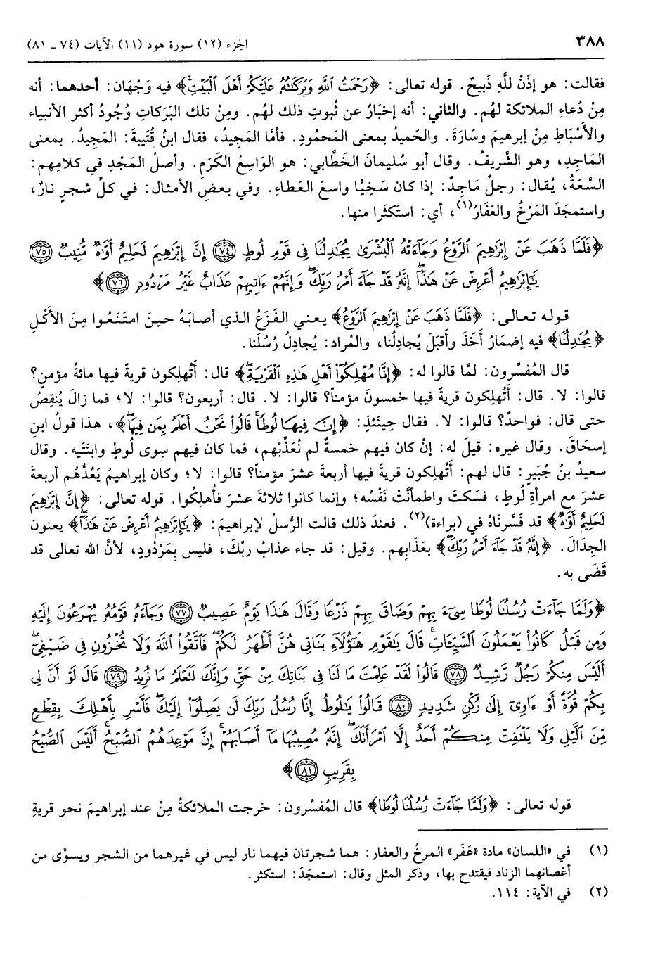 فَلَمَّا ذَهَبَ عَنْ إِبْراهِيمَ الرَّوْعُ وَجاءَتْهُ الْبُشْرى يُجادِلُنا فِي قَوْمِ لُوطٍ (74) إِنَّ إِبْراهِيمَ لَحَلِيمٌ أَوَّاهٌ مُنِيبٌ (75) يا إِبْراهِيمُ أَعْرِضْ عَنْ هذا إِنَّهُ قَدْ جاءَ أَمْرُ رَبِّكَ وَإِنَّهُمْ آتِيهِمْ عَذابٌ غَيْرُ مَرْدُودٍ (76)