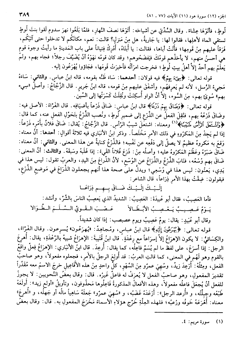 قوله تعالى: يُهْرَعُونَ إِلَيْهِ قال ابن عباس، ومجاهد: «يهرعون» يسرعون. وقال الفراء، والكسائي: لا يكون الإِهراع إِلا إِسراعاً مع رِعدة. قال ابن قتيبة: الإِهراع شبيه بالرِعدة، يقال: أُهرع الرجل: إِذا أسرع، على لفظ ما لم يسم فاعله، كما يقال: أُرعد. قال ابن الأنباري: الإِهراع فعل واقع بالقوم وهو لَهم في المعنى، كما قالت العرب: قد أُولع الرجل بالأمر، فجعلوه مفعولاً، وهو صاحب الفعل، ومثله: أُرعد زيد، وسُهي عمرو من السهو، كل واحد من هذه الأفاعيل خرج الاسم معه مقدراً تقدير المفعول، وهو صاحب الفعل لا يُعرف له فاعل غيره. قال: وقال بعض النحويين: لا يجوز للفعل أن يُجعل فاعله مفعولاً، وهذه الأفعال المذكورة فاعلوها محذوفون، وتأويل «أولع زيد» : أولعه طبعه وجِبلَّته، و «أرعد الرجل» : أرعده غضبه، و «سهي عمرو» جعله ساهياً مالُه أو جهله، و «أُهرع» معناه: أهرعه خوفه ورعبه فلهذه العلة خرِّج هؤلاء الأسماء مخرج المفعول به. قال: وقال بعض