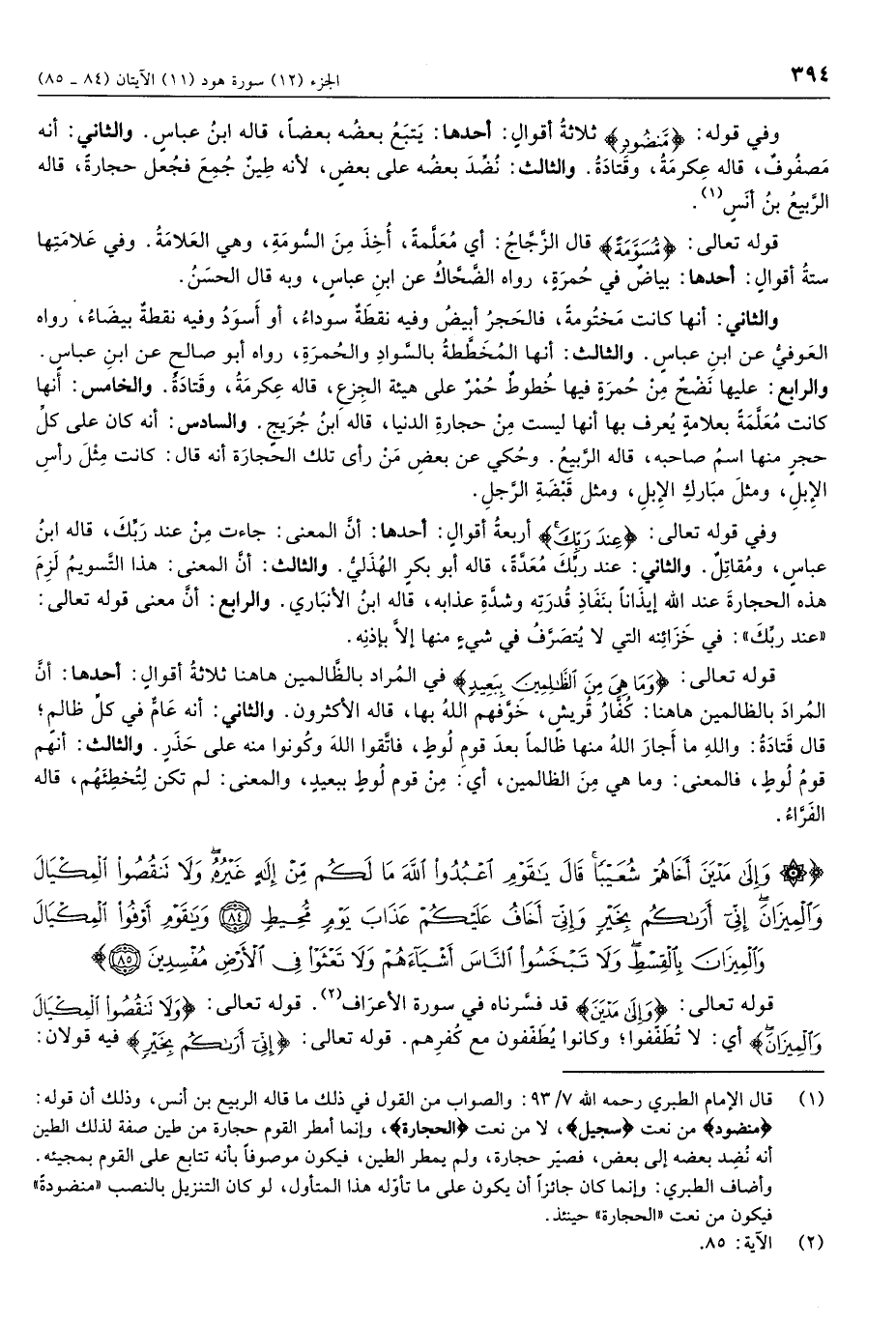 وأضاف الطبري: وإنما كان جائزا أن يكون على ما تأوّله هذا المتأول، لو كان التنزيل بالنصب «منضودة» فيكون من نعت «الحجارة» حينئذ.