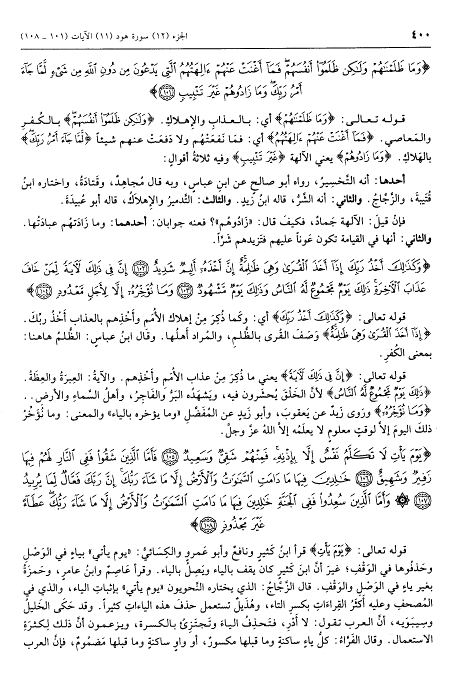 قوله تعالى: يَوْمَ يَأْتِ قرأ ابن كثير ونافع وأبو عمرو والكسائي: «يوم يأتي» بياء في الوصل وحذفوها في الوقف غير أن ابن كثير كان يقف بالياء ويصل بالياء. وقرأ عاصم وابن عامر، وحمزة بغير ياء في الوصل والوقف. قال الزجاج: الذي يختاره النحويون «يوم يأتي» باثبات الياء، والذي في المصحف وعليه أكثر القراءات بكسر التاء، وهذيل تستعمل حذف هذه الياءات كثيراً. وقد حكى الخليل وسيبويه، أن العرب تقول: لا أدرِ، فتحذف الياء وتجتزئ بالكسرة، ويزعمون أن ذلك لكثرة الاستعمال. وقال الفراء: كل ياء ساكنة وما قبلها مكسور، أو واو ساكنة وما قبلها مضموم، فإن العرب