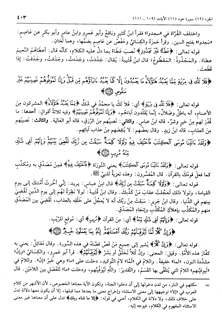 فَلا تَكُ فِي مِرْيَةٍ مِمَّا يَعْبُدُ هؤُلاءِ ما يَعْبُدُونَ إِلاَّ كَما يَعْبُدُ آباؤُهُمْ مِنْ قَبْلُ وَإِنَّا لَمُوَفُّوهُمْ نَصِيبَهُمْ غَيْرَ مَنْقُوصٍ (109)