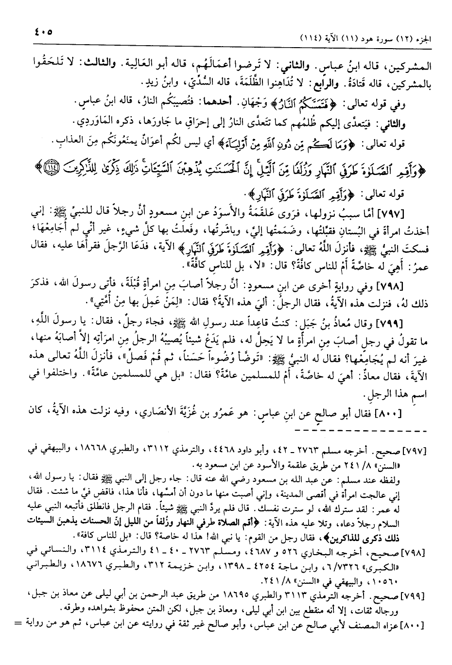 (798) وفي رواية أخرى عن ابن مسعود: أن رجلاً أصاب من امرأة قبلة، فأتى رسول الله، فذكر ذلك له، فنزلت هذه الآية، فقال الرجل: أليَ هذه الآية؟ فقال: «لمن عمل بها من أمتي» .