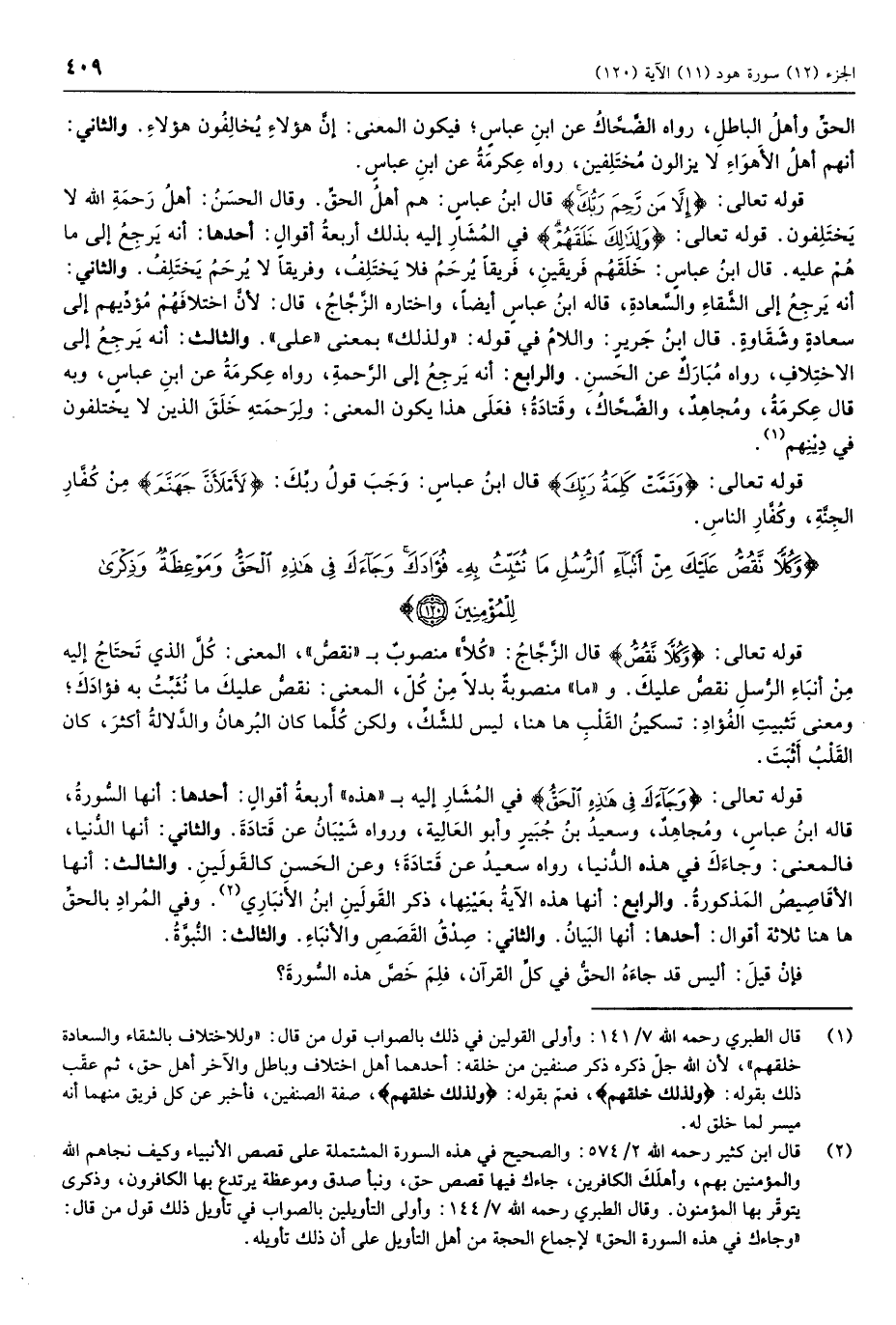 (1) قال الطبري رحمه الله 7/ 141: وأولى القولين في ذلك بالصواب قول من قال: «وللاختلاف بالشقاء والسعادة خلقهم» ، لأن الله جلّ ذكره ذكر صنفين من خلقه: أحدهما أهل اختلاف وباطل والآخر أهل حق، ثم عقّب ذلك بقوله: وَلِذلِكَ خَلَقَهُمْ، فعمّ بقوله: وَلِذلِكَ خَلَقَهُمْ، صفة الصنفين، فأخبر عن كل فريق منهما أنه ميسر لما خلق له.