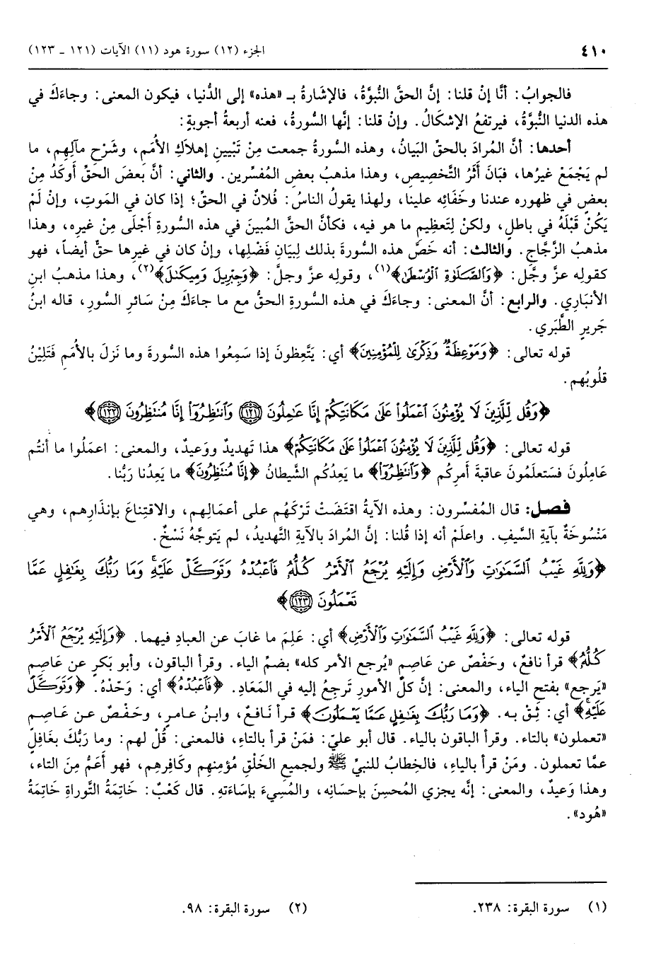 قوله تعالى: وَلِلَّهِ غَيْبُ السَّماواتِ وَالْأَرْضِ أي: علم ما غاب عن العباد فيهما. وَإِلَيْهِ يُرْجَعُ الْأَمْرُ كُلُّهُ قرأ نافع، وحفص عن عاصم «يُرجع الأمر كله» بضم الياء. وقرأ الباقون، وأبو بكر عن عاصم «يَرجع» بفتح الياء، والمعنى: إِن كل الأمور ترجع إِليه في المعاد. فَاعْبُدْهُ أي: وحِّده. وَتَوَكَّلْ عَلَيْهِ أي: ثِقْ به. وَما رَبُّكَ بِغافِلٍ عَمَّا يَعْمَلُونَ قرأ نافع، وابن عامر، وحفص عن عاصم «تعلمون» بالتاء. وقرأ الباقون بالياء. قال أبو علي: فمن قرأ بالتاء، فالمعنى: قل لهم: وما ربك بغافل عما تعملون. ومن قرأ بالياء، فالخطاب للنبيّ صلى الله عليه وسلم ولجميع الخلق مؤمِنهم وكافِرهم، فهو أعم من التاء، وهذا وعيد، والمعنى: إِنه يجزي المحسن بإحسانه، والمسيء بإساءته. قال كعب: خاتمة التوراة خاتمة «هود» .
