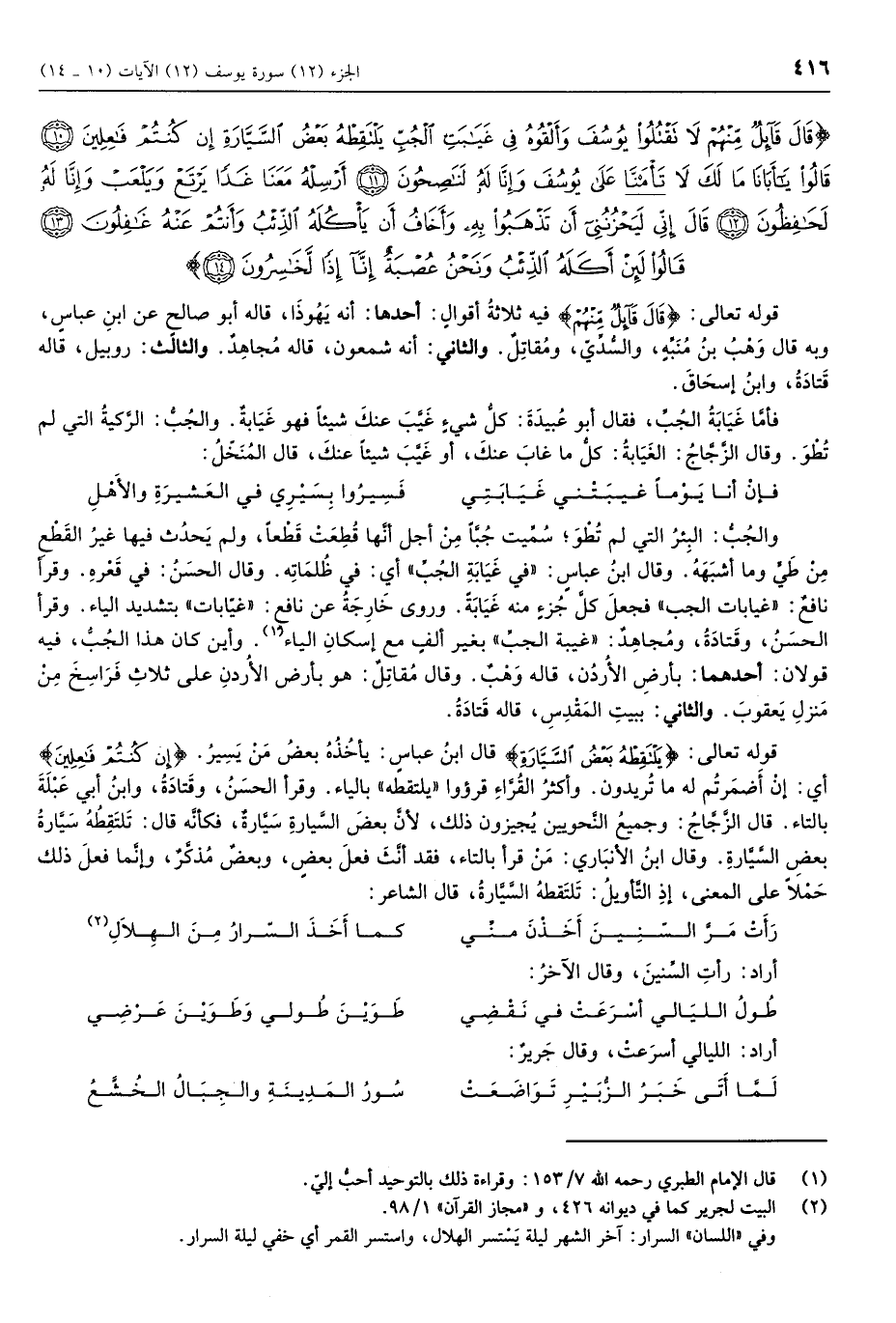 قالَ قائِلٌ مِنْهُمْ لا تَقْتُلُوا يُوسُفَ وَأَلْقُوهُ فِي غَيابَتِ الْجُبِّ يَلْتَقِطْهُ بَعْضُ السَّيَّارَةِ إِنْ كُنْتُمْ فاعِلِينَ (10) قالُوا يا أَبانا ما لَكَ لا تَأْمَنَّا عَلى يُوسُفَ وَإِنَّا لَهُ لَناصِحُونَ (11) أَرْسِلْهُ مَعَنا غَداً يَرْتَعْ وَيَلْعَبْ وَإِنَّا لَهُ لَحافِظُونَ (12) قالَ إِنِّي لَيَحْزُنُنِي أَنْ تَذْهَبُوا بِهِ وَأَخافُ أَنْ يَأْكُلَهُ الذِّئْبُ وَأَنْتُمْ عَنْهُ غافِلُونَ (13) قالُوا لَئِنْ أَكَلَهُ الذِّئْبُ وَنَحْنُ عُصْبَةٌ إِنَّا إِذاً لَخاسِرُونَ (14)