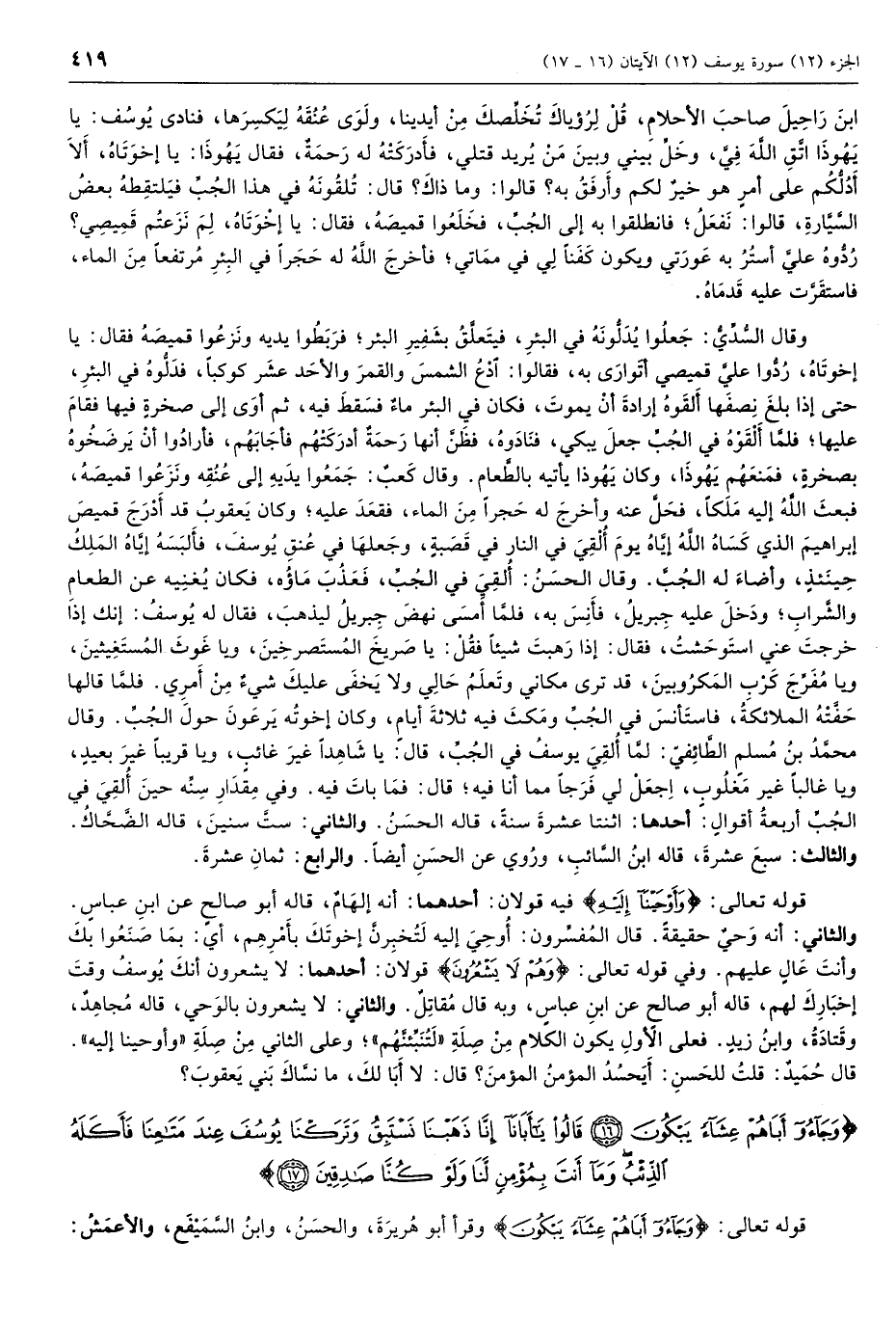 ابن راحيل صاحبَ الأحلام، قل لرؤياك تخلصك من أيدينا، ولوى عنقه ليكسرها، فنادى يوسف: يا يهوذا اتق الله فيّ، وخل بيني وبين مَنْ يريد قتلي، فأدركته له رحمة، فقال يهوذا: يا إِخوتاه، ألا أدلكم على أمرٍ هو خير لكم وأرفق به؟ قالوا: وما ذاك؟ قال: تلقونه في هذا الجب فيلتقطه بعض السّيّارة، قالوا: نفعل فانطلقوا به إِلى الجب، فخلعوا قميصه، فقال: يا إِخوتاه، لِمَ نزعتم قميصي؟