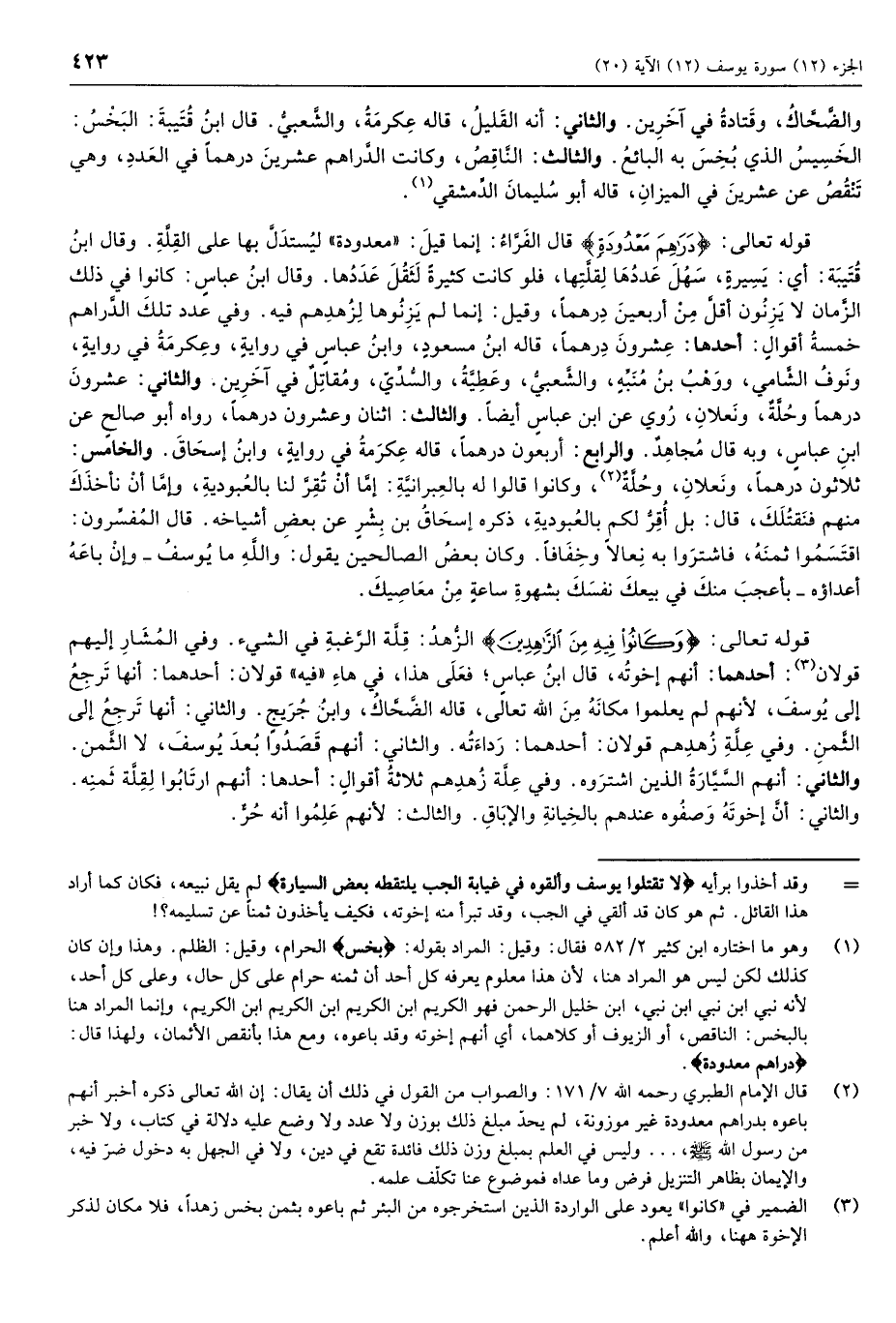 (2) قال الإمام الطبري رحمه الله 7/ 171: والصواب من القول في ذلك أن يقال: إن الله تعالى ذكره أخبر أنهم باعوه بدراهم معدودة غير موزونة، لم يحدّ مبلغ ذلك بوزن ولا عدد ولا وضع عليه دلالة في كتاب، ولا خبر من رسول الله صلى الله عليه وسلم، ... وليس في العلم بمبلغ وزن ذلك فائدة تقع في دين، ولا في الجهل به دخول ضرّ فيه، والإيمان بظاهر التنزيل فرض وما عداه فموضوع عنا تكلّف علمه.