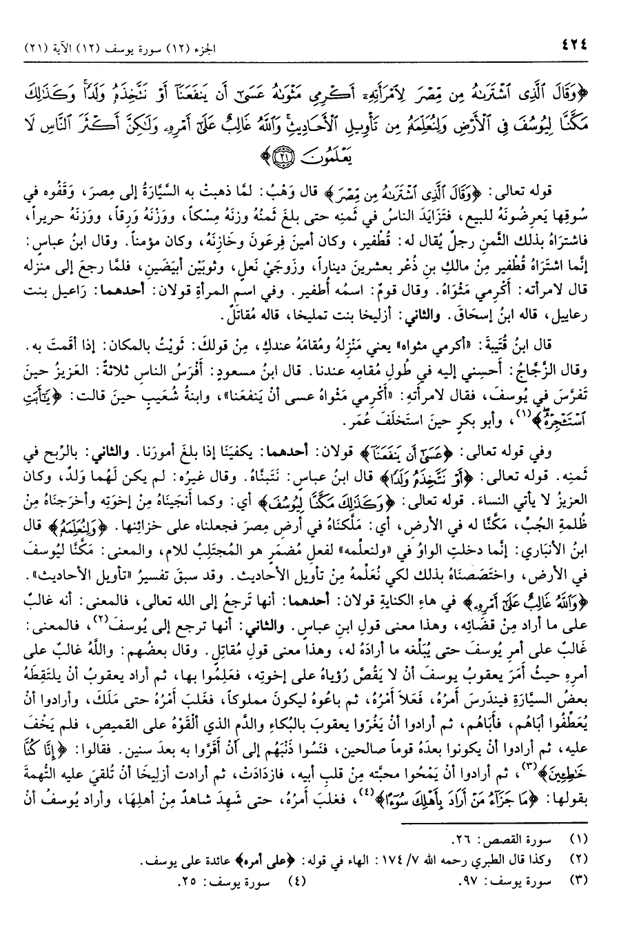 وَقالَ الَّذِي اشْتَراهُ مِنْ مِصْرَ لامْرَأَتِهِ أَكْرِمِي مَثْواهُ عَسى أَنْ يَنْفَعَنا أَوْ نَتَّخِذَهُ وَلَداً وَكَذلِكَ مَكَّنَّا لِيُوسُفَ فِي الْأَرْضِ وَلِنُعَلِّمَهُ مِنْ تَأْوِيلِ الْأَحادِيثِ وَاللَّهُ غالِبٌ عَلى أَمْرِهِ وَلكِنَّ أَكْثَرَ النَّاسِ لا يَعْلَمُونَ (21)