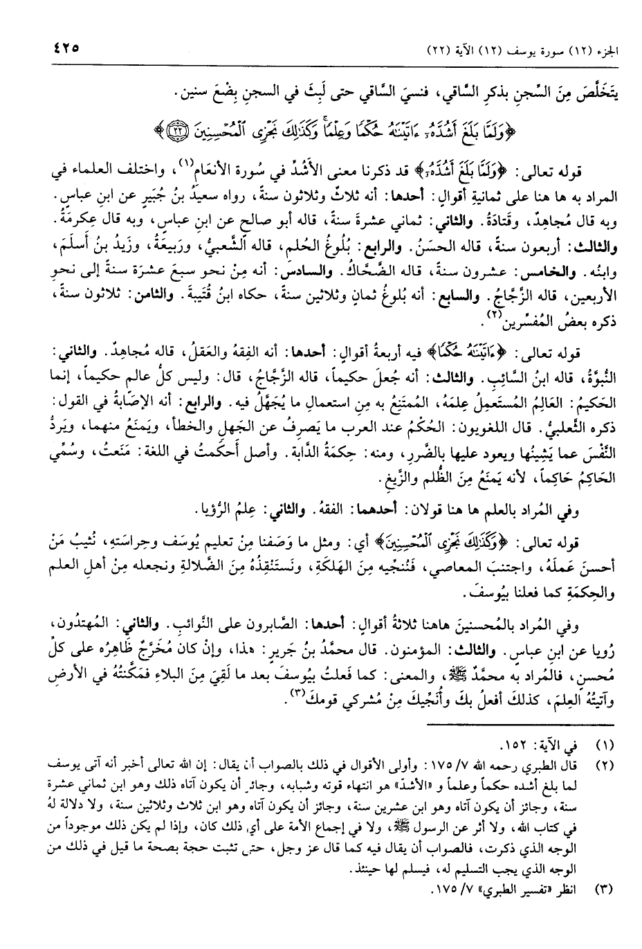 (2) قال الطبري رحمه الله 7/ 175: وأولى الأقوال في ذلك بالصواب أن يقال: إن الله تعالى أخبر أنه آتى يوسف لما بلغ أشده حكما وعلما و «الأشدّ» هو انتهاء قوته وشبابه، وجائز أن يكون آتاه ذلك وهو ابن ثماني عشرة سنة، وجائز أن يكون آتاه وهو ابن عشرين سنة، وجائز أن يكون آتاه وهو ابن ثلاث وثلاثين سنة، ولا دلالة له في كتاب الله، ولا أثر عن الرسول صلى الله عليه وسلم، ولا في إجماع الأمة على أي ذلك كان، وإذا لم يكن ذلك موجودا من الوجه الذي ذكرت، فالصواب أن يقال فيه كما قال عز وجل، حتى تثبت حجة بصحة ما قيل في ذلك من الوجه الذي يجب التسليم له، فيسلم لها حينئذ.