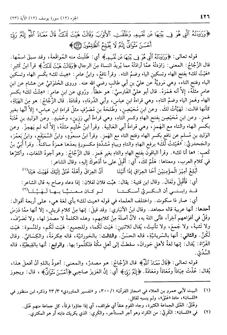 قال الزجاج: المعنى: راودته عما أرادته مما يريد النساء من الرجال وَقالَتْ هَيْتَ لَكَ قرأ ابن كثير: