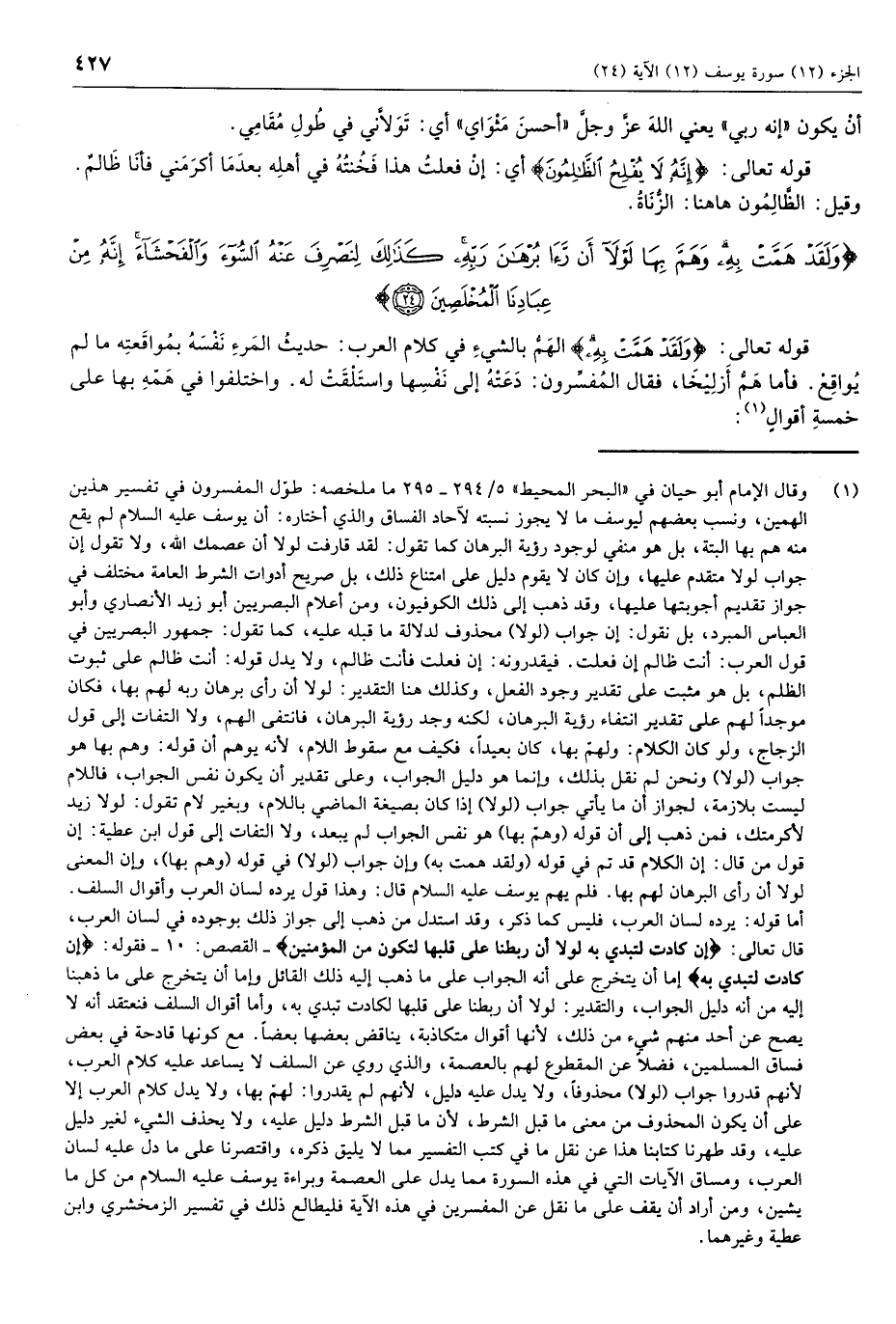 أما قوله: يرده لسان العرب، فليس كما ذكر، وقد استدل من ذهب إلى جواز ذلك بوجوده في لسان العرب، قال تعالى: إِنْ كادَتْ لَتُبْدِي بِهِ لَوْلا أَنْ رَبَطْنا عَلى قَلْبِها لِتَكُونَ مِنَ الْمُؤْمِنِينَ- القصص: 10- فقوله: إِنْ كادَتْ لَتُبْدِي بِهِ إما أن يتخرج على أنه الجواب على ما ذهب إليه ذلك القائل وإما أن يتخرج على ما ذهبنا إليه من أنه دليل الجواب، والتقدير: لولا أن ربطنا على قلبها لكادت تبدي به، وأما أقوال السلف فنعتقد أنه لا يصح عن أحد منهم شيء من ذلك، لأنها أقوال متكاذبة، يناقض بعضها بعضا. مع كونها قادحة في بعض فساق المسلمين، فضلا عن المقطوع لهم بالعصمة، والذي روي عن السلف لا يساعد عليه كلام العرب، لأنهم قدروا جواب (لولا) محذوفا، ولا يدل عليه دليل، لأنهم لم يقدروا: لهمّ بها، ولا يدل كلام العرب إلا على أن يكون المحذوف من معنى ما قبل الشرط، لأن ما قبل الشرط دليل عليه، ولا يحذف الشيء لغير دليل عليه، وقد طهرنا كتابنا هذا عن نقل ما في كتب التفسير مما لا يليق ذكره، واقتصرنا على ما دل عليه لسان العرب، ومساق الآيات التي في هذه السورة مما يدل على العصمة وبراءة يوسف عليه السلام من كل ما يشين، ومن أراد أن يقف على ما نقل عن المفسرين في هذه الآية فليطالع ذلك في تفسير الزمخشري وابن عطية وغيرهما. [.....]
