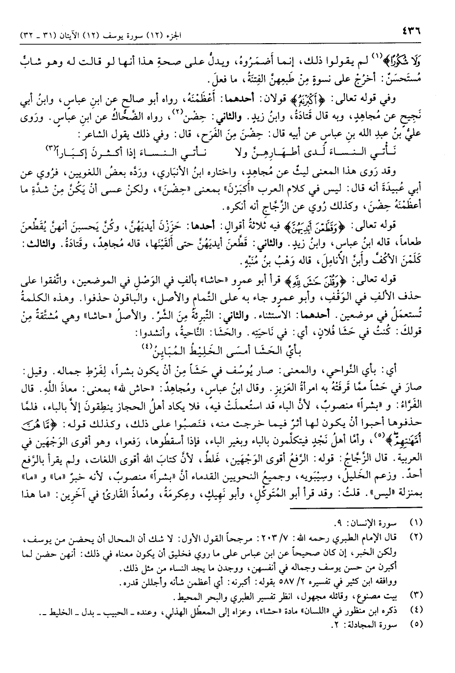 (2) قال الإمام الطبري رحمه الله: 7/ 203: مرجحا القول الأول: لا شك أن المحال أن يحضن من يوسف، ولكن الخبر، إن كان صحيحا عن ابن عباس على ما روي فخليق أن يكون معناه في ذلك: أنهن حضن لما أكبرن من حسن يوسف وجماله في أنفسهن، ووجدن ما يجد النساء من مثل ذلك.