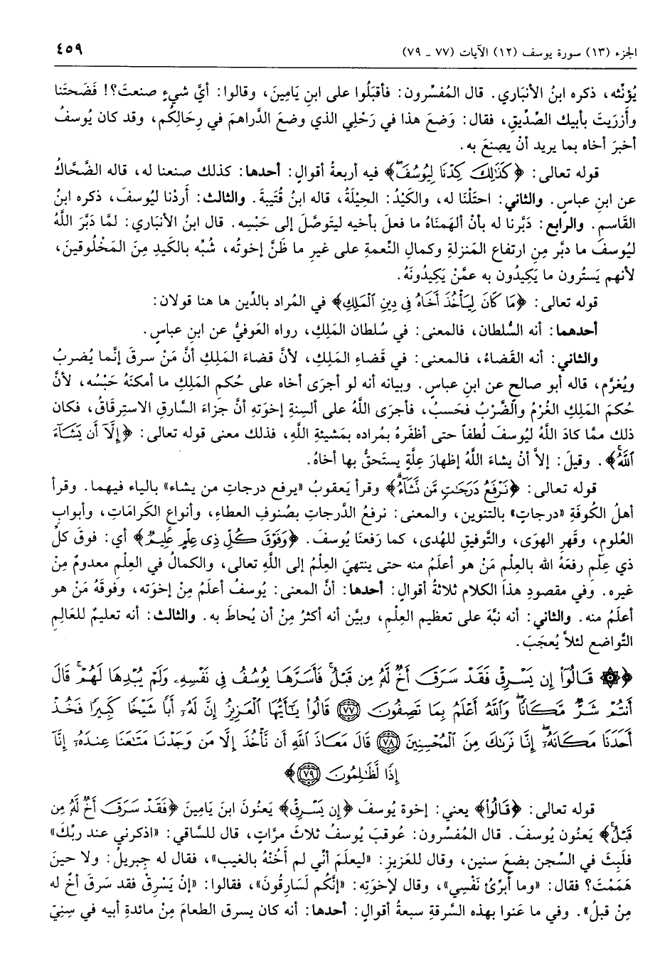 والثاني: أنه القضاء، فالمعنى: في قضاء الملك، لأن قضاء الملك أن من سرق إِنما يُضرب ويُغرَّم، قاله أبو صالح عن ابن عباس. وبيانه أنه لو أجرى أخاه على حكم الملك ما أمكنه حبسه، لأن حكم الملك الغرم والضرب فحسب، فأجرى الله على ألسنة إِخوته أن جزاء السارق الاسترقاق، فكان ذلك مما كاد الله ليوسف لطفاً حتى أظفره بمراده بمشيئة الله، فذلك معنى قوله تعالى: إِلَّا أَنْ يَشاءَ اللَّهُ. وقيل: إِلا أن يشاء الله إِظهار علَّة يستحق بها أخاه.