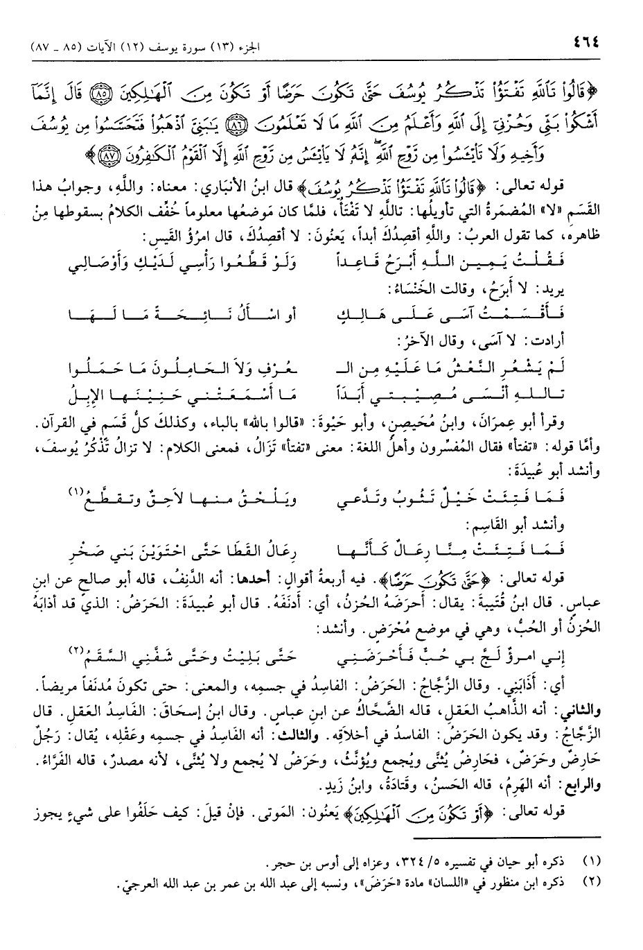 وأما قوله: «تفتأ» فقال المفسرون وأهل اللغة: معنى «تفتأ» تزال، فمعنى الكلام: لا تزال تذكر يوسف، وأنشد أبو عبيدة:
