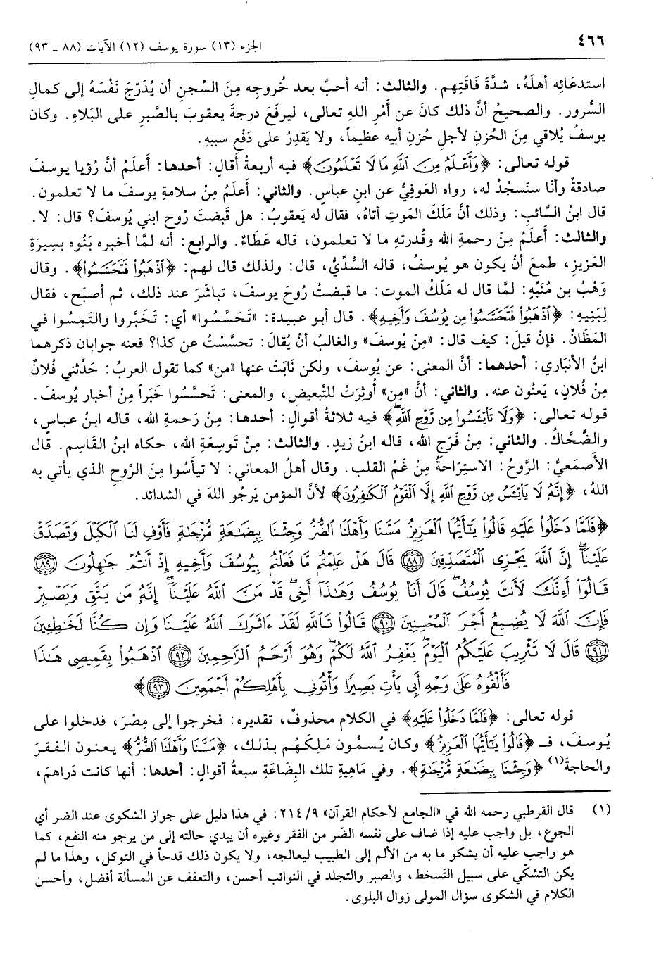 (1) قال القرطبي رحمه الله في «الجامع لأحكام القرآن» 9/ 214: في هذا دليل على جواز الشكوى عند الضر أي الجوع، بل واجب عليه إذا ضاف على نفسه الضّر من الفقر وغيره أن يبدي حالته إلى من يرجو منه النفع، كما هو واجب عليه أن يشكو ما به من الألم إلى الطبيب ليعالجه، ولا يكون ذلك قدحا في التوكل، وهذا ما لم يكن التشكّي على سبيل التّسخط، والصبر والتجلد في النوائب أحسن، والتعفف عن المسألة أفضل، وأحسن الكلام في الشكوى سؤال المولى زوال البلوى.
