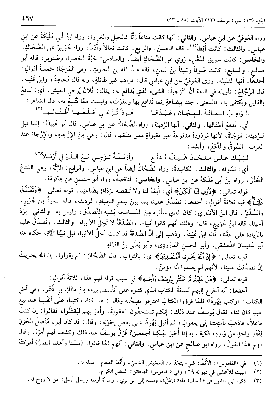 قوله تعالى: فَأَوْفِ لَنَا الْكَيْلَ أي: أتمه لنا ولا تنقصه لرداءة بضاعتنا. قوله تعالى: وَتَصَدَّقْ عَلَيْنا فيه ثلاثة أقوال: أحدها: تصدَّق علينا بما بين سعر الجياد والرديئة، قاله سعيد بن جبير، والسدي. قال ابن الأنباري: كان الذي سألوه من المسامحة يشبه التصدُّق، وليس به. والثاني: بردّ أخينا، قاله ابن جريج، قال: وذلك أنهم كانوا أنبياء، والصَّدَقَةُ لا تحل للأنبياء. والثالث: وتصدَّق علينا بالزيادة على حقِّنا، قاله ابن عيينة، وذهب إِلى أن الصدقة قد كانت تحل للأنبياء قبل نبيّنا صلّى الله عليه وسلم، حكاه عنه أبو سليمان الدمشقي، وأبو الحسن الماوردي، وأبو يعلى بن الفراء.