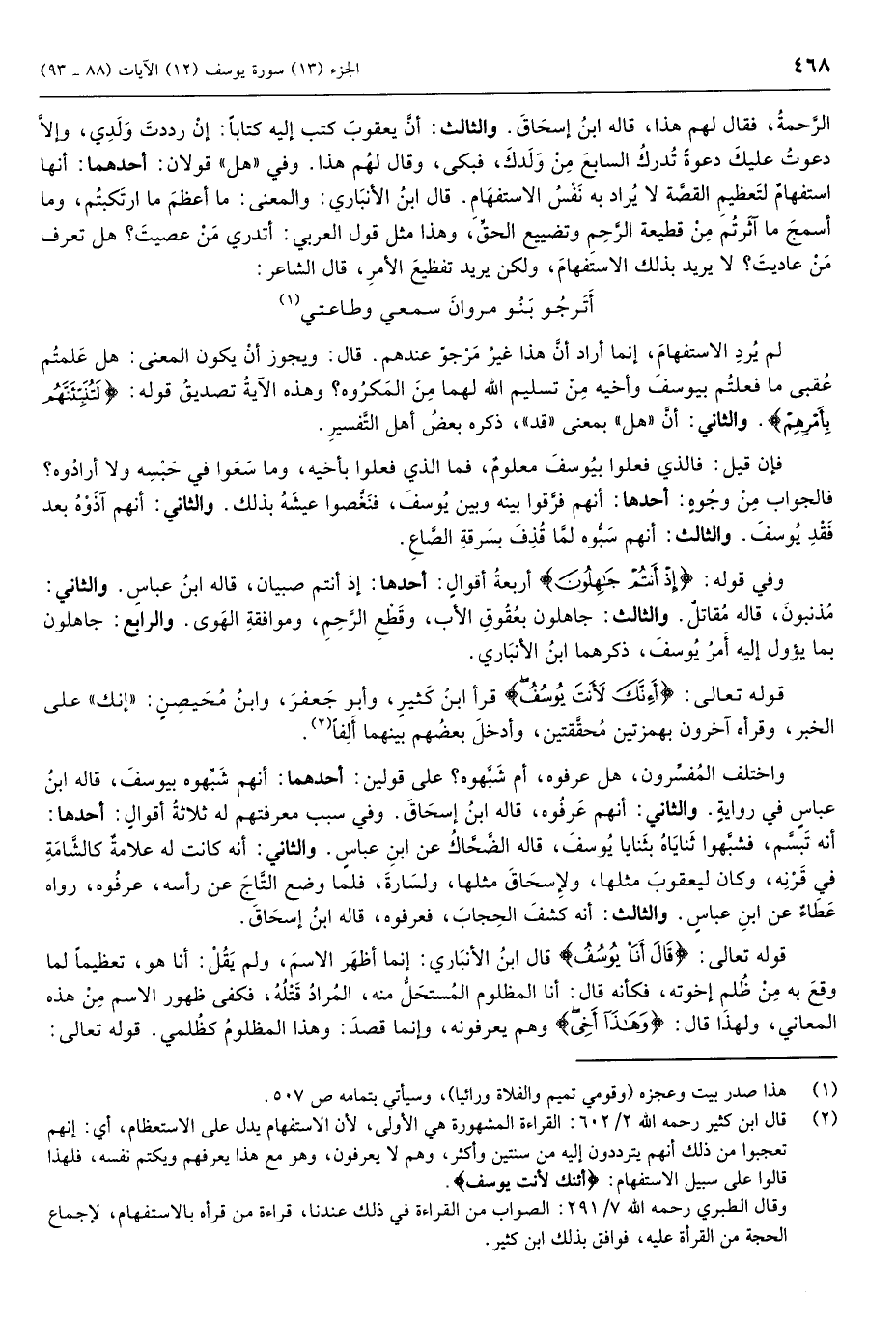 (2) قال ابن كثير رحمه الله 2/ 602: القراءة المشهورة هي الأولى، لأن الاستفهام يدل على الاستعظام، أي: إنهم تعجبوا من ذلك أنهم يترددون إليه من سنتين وأكثر، وهم لا يعرفون، وهو مع هذا يعرفهم ويكتم نفسه، فلهذا قالوا على سبيل الاستفهام: أَإِنَّكَ لَأَنْتَ يُوسُفُ.