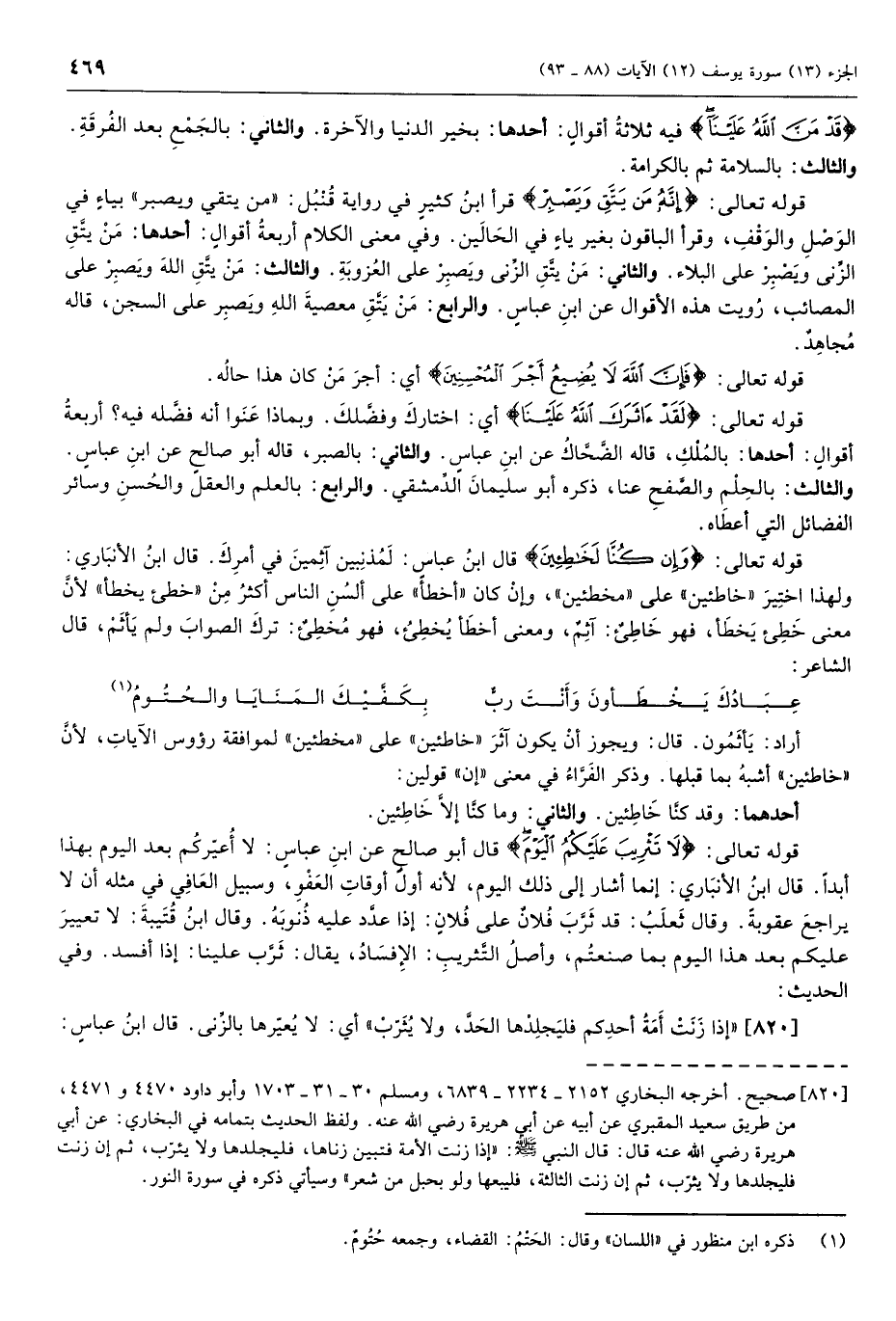 قوله تعالى: إِنَّهُ مَنْ يَتَّقِ وَيَصْبِرْ قرأ ابن كثير في رواية قنبل: «من يتقي ويصبر» بياء في الوصل والوقف، وقرأ الباقون بغير ياء في الحالين. وفي معنى الكلام أربعة أقوال: أحدها: من يتق الزنى ويصبر على البلاء. والثاني: من يتّق الزّنى ويصبر على العزوبة. والثالث: من يتق الله ويصبر على المصائب، رويت هذه الأقوال عن ابن عباس. والرابع: من يتق معصية الله ويصبر على السجن، قاله مجاهد.