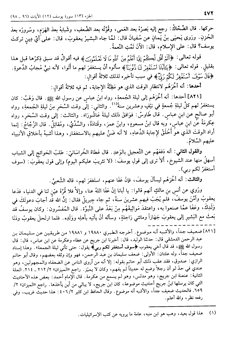 ضعيف جدا، والأشبه أنه موضوع. أخرجه الطبري 19880 و 19881 من طريقين عن سليمان بن عبد الرحمن الدمشقي قال: حدثنا الوليد، قال: أخبرنا ابن جريج عن عطاء وعكرمة عن ابن عباس، قال: قال رسول الله صلّى الله عليه وسلم، قد قال أخي يعقوب سَوْفَ أَسْتَغْفِرُ لَكُمْ رَبِّي يقول: حتى تأتي ليلة الجمعة» . وهذا إسناد ضعيف جدا، وله علتان: الأولى: ضعف سليمان بن عبد الرحمن، فهو وإن وثقه بعضهم، وقال أبو حاتم الرازي: صدوق، فقد عقب ذلك أبو حاتم بقوله: إلا أنه من أروى الناس عن الضعفاء والمجهولين، وهو عندي في حدّ لو أن رجلا وضع له حديثا لم يفهم، وكان لا يميّز. راجع «الميزان» 2/ 212- 214. العلة الثانية: عنعنة ابن جريج، وهو مدلس، وهو لم يسمع من عكرمة. قال الإمام أحمد: بعض هذه الأحاديث التي كان يرسلها ابن جريج أحاديث موضوعة، كان ابن جريج، لا يبالي من أين يأخذها. راجع «الميزان» 2/ 659. فالحديث ضعيف جدا، والأشبه أنه موضوع. وقال الحافظ ابن كثير 2/ 406: هذا حديث غريب، وفي رفعه نظر، والله أعلم.