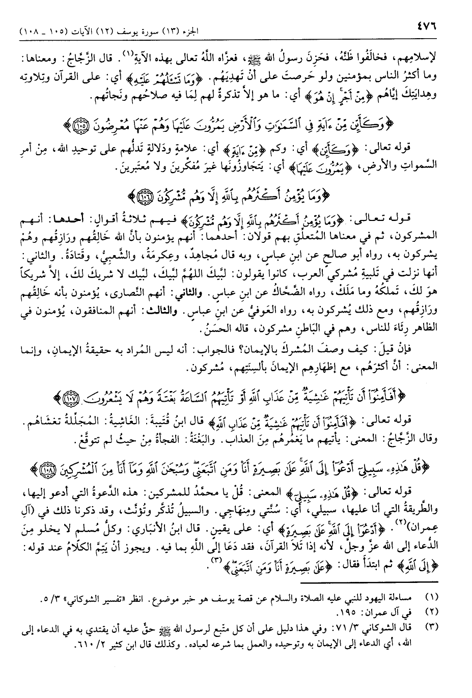 (3) قال الشوكاني 3/ 71: وفي هذا دليل على أن كل متّبع لرسول الله صلى الله عليه وسلم حقّ عليه أن يقتدي به في الدعاء إلى الله، أي الدعاء إلى الإيمان به وتوحيده والعمل بما شرعه لعباده. وكذلك قال ابن كثير 2/ 610.