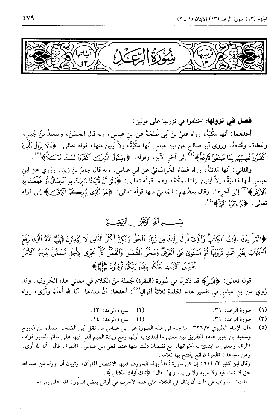 (5) قال الإمام الطبري 7/ 326: ما جاء في هذه السورة عن ابن عباس من نقل أبي الضحى مسلم بن صبيح وسعيد بن جبير عنه، التفريق بين معنى ما ابتدئ به أولها ومع زيادة الميم التي فيها على سائر السور ذوات «الر» ، ومعنى ما ابتدئ به أخواتها، مع نقصان ذلك منها عنها فعن ابن عباس: «المر» ، قال: أنا الله أرى.