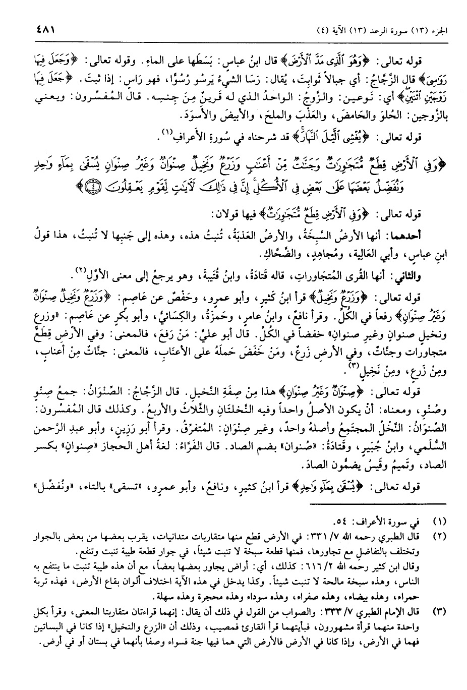 (3) قال الإمام الطبري 7/ 333: والصواب من القول في ذلك أن يقال: إنهما قراءتان متقاربتا المعنى، وقرأ بكل واحدة منهما قراء مشهورون، فبأيتهما قرأ القارئ فمصيب، وذلك أن «الزرع والنخيل» إذا كانا في البساتين فهما في الأرض، وإذا كانا في الأرض فالأرض التي هما فيها جنة فسواء وصفا بأنهما في بستان أو في أرض.