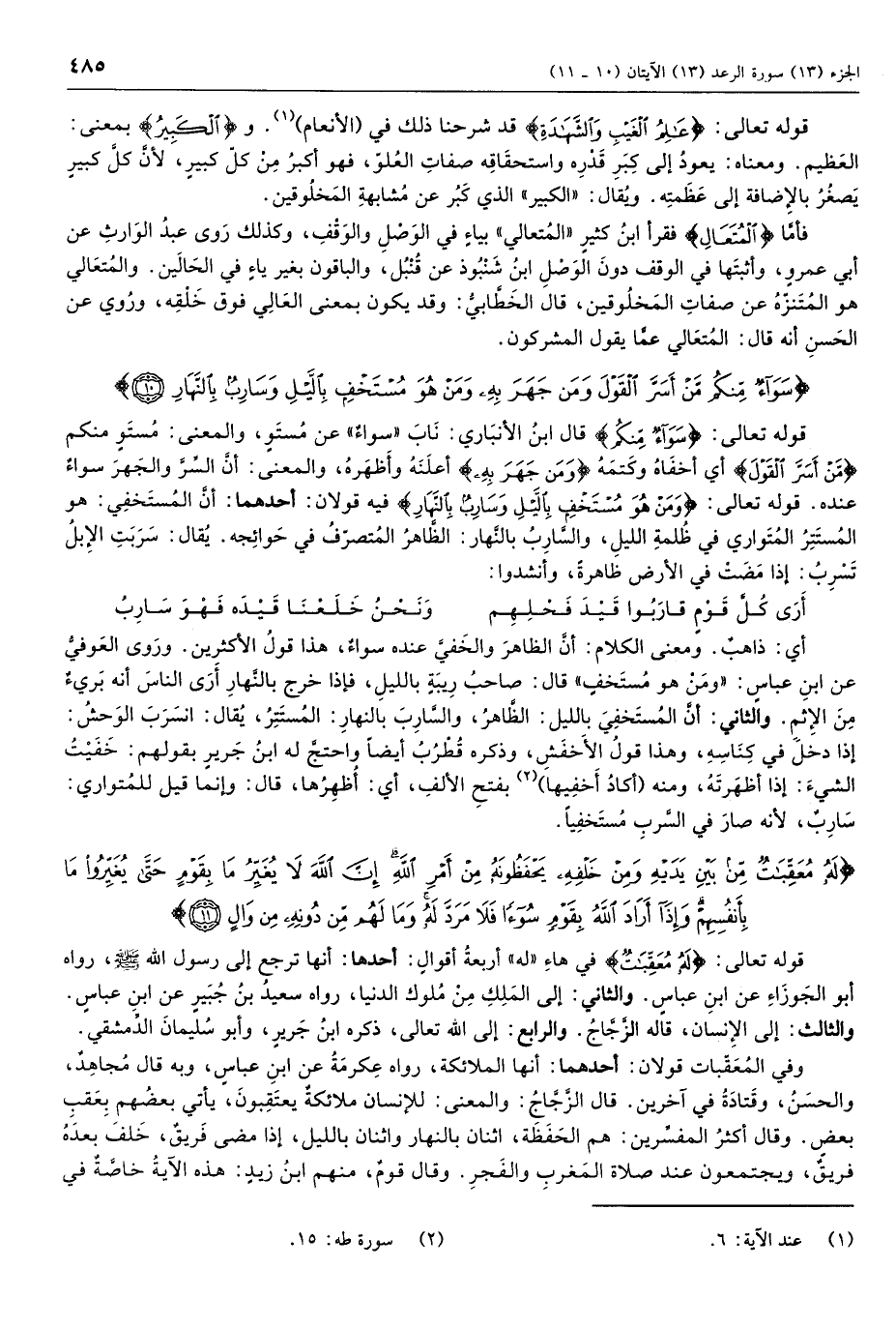 قوله تعالى: سَواءٌ مِنْكُمْ قال ابن الأنباري: ناب «سواءٌ» عن مُستوٍ، والمعنى: مستوٍ منكم مَنْ أَسَرَّ الْقَوْلَ أي أخفاه وكتمه وَمَنْ جَهَرَ بِهِ أعلنه وأظهره، والمعنى: أن السِرَّ والجهر سواء عنده. قوله تعالى: وَمَنْ هُوَ مُسْتَخْفٍ بِاللَّيْلِ وَسارِبٌ بِالنَّهارِ فيه قولان: أحدهما: أن المستخفي: هو المستتر المتواري في ظلمة الليل، والسارب بالنهار: الظاهر المتصرِّف في حوائجه. يقال: سرَبتِ الإِبل تَسرِب: إِذا مضت في الأرض ظاهرةً، وأنشدوا: